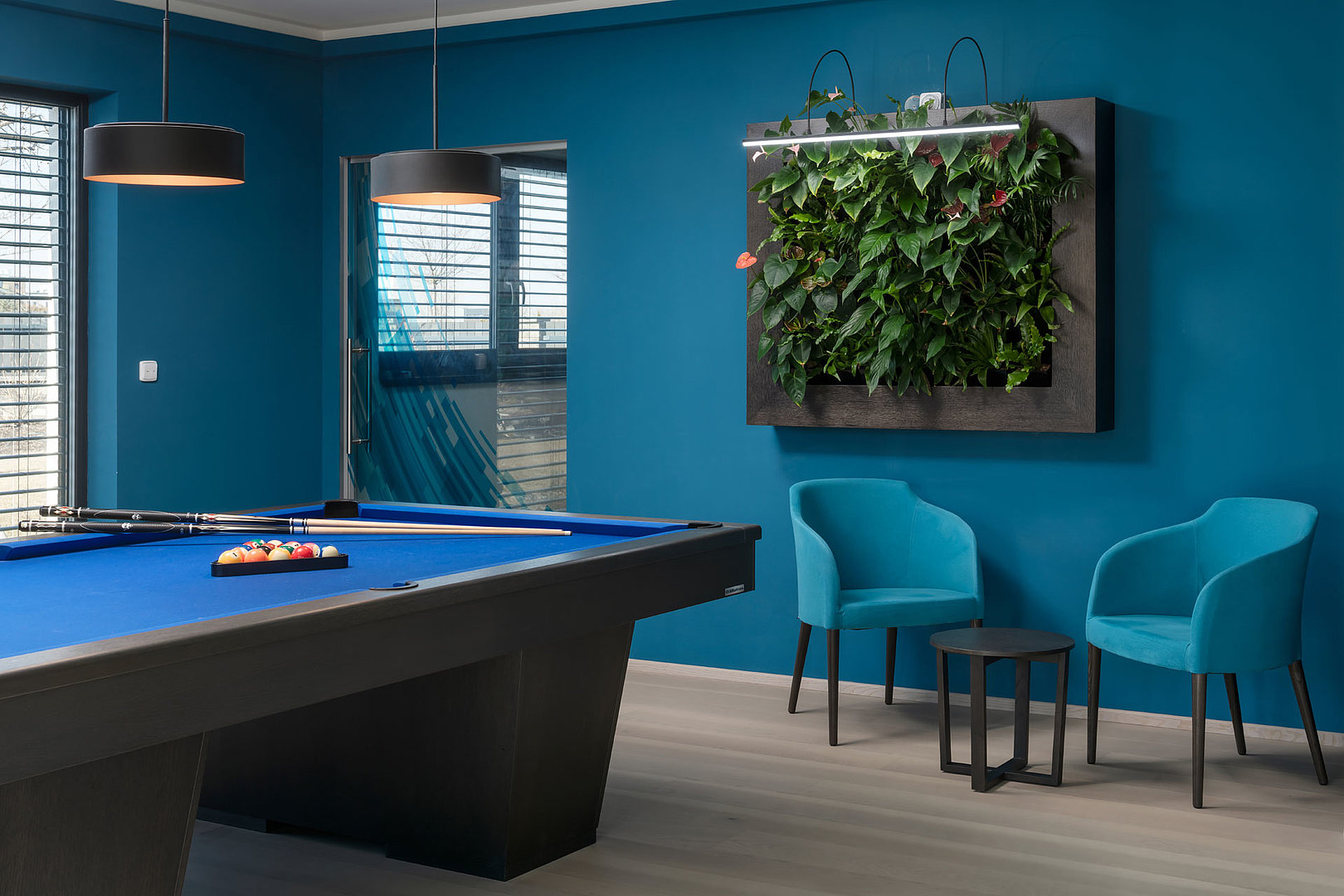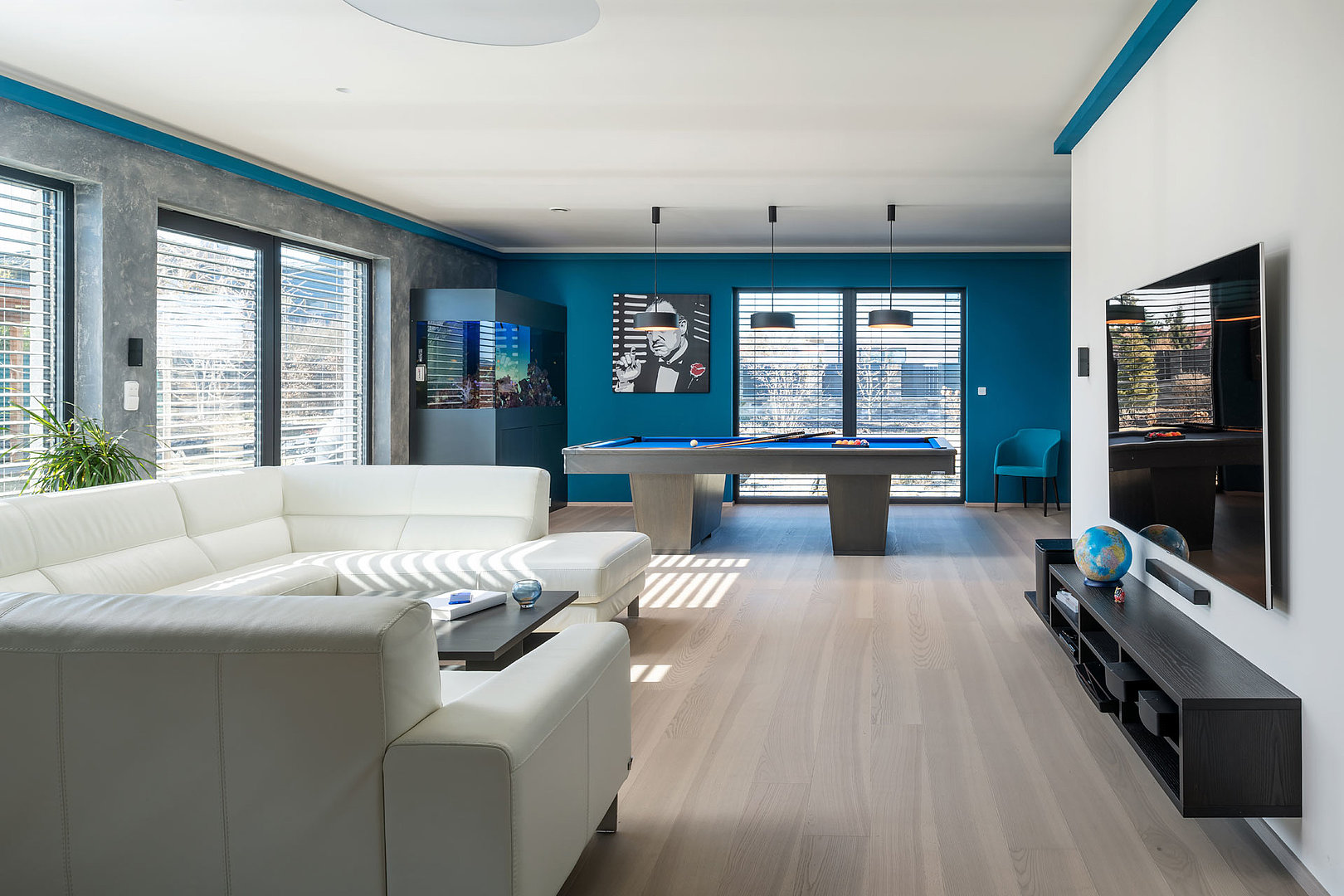 Individuální minimalistický obývací pokoj, kde dominuje kulečníkový stůl a výrazná tyrkysová stěna. Sedací souprava v bílé kůži, konferenční stolek s kovovými detaily a závěsné skříňky pod televizi celý prostor vkusně doplňují.
