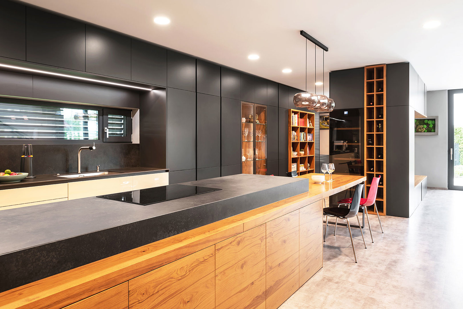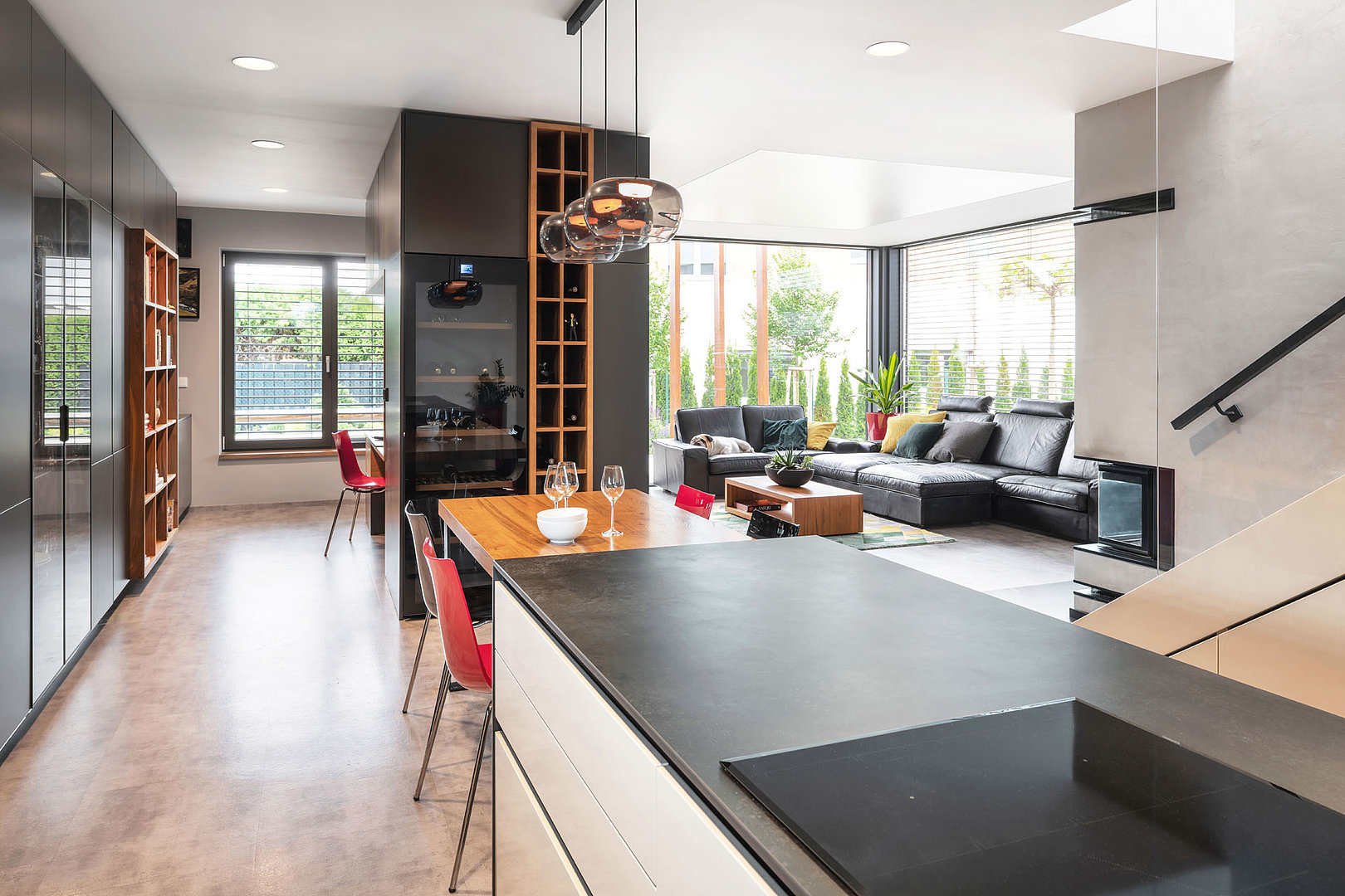 Důmyslné a praktické vytvoření potřebného pracovního místa, které vzniklo díky dělící stěně v obývací místnost.