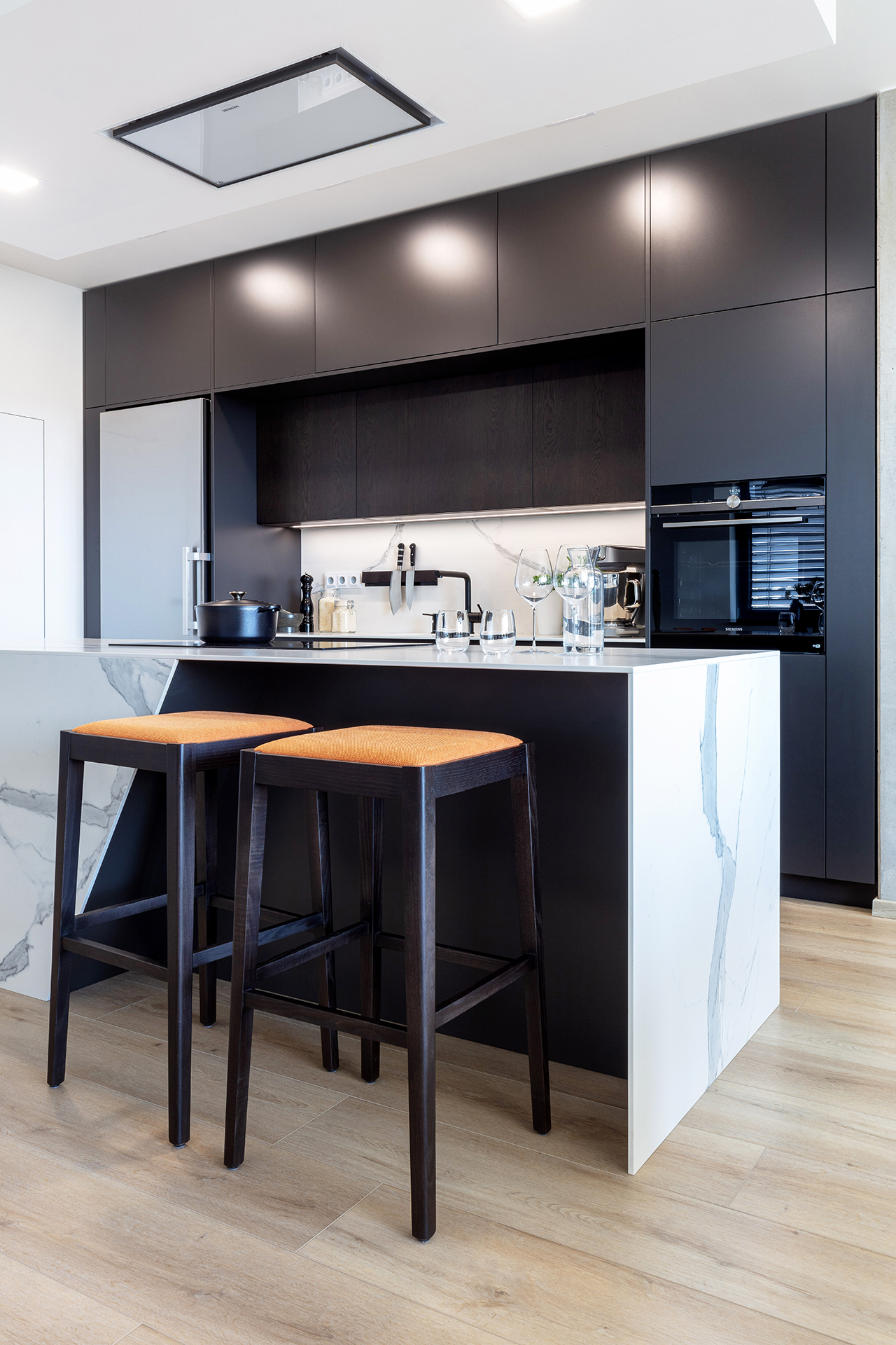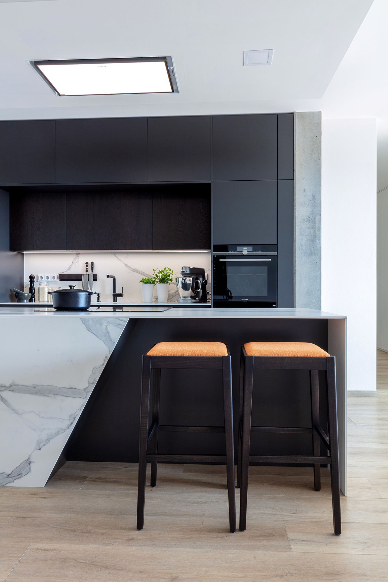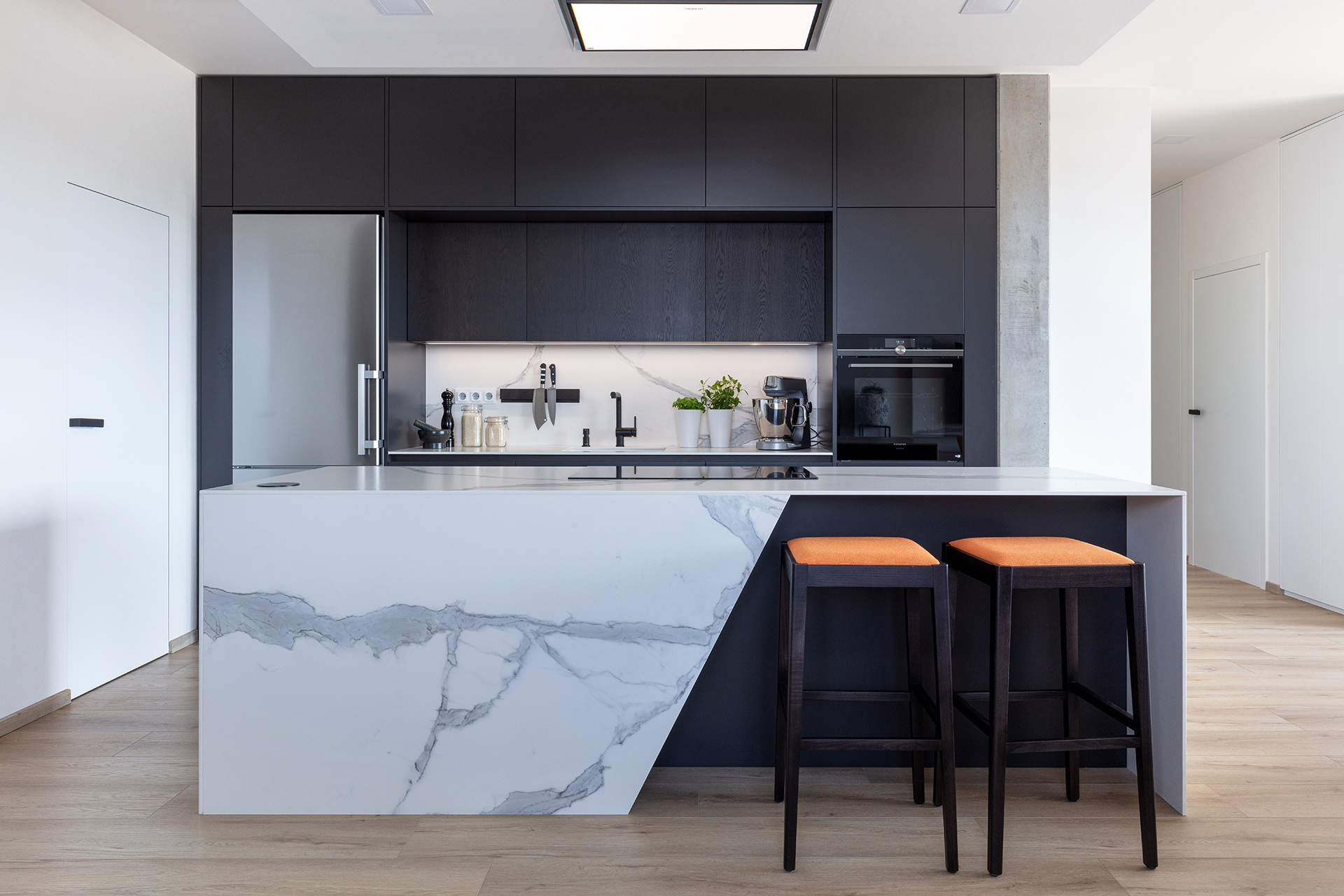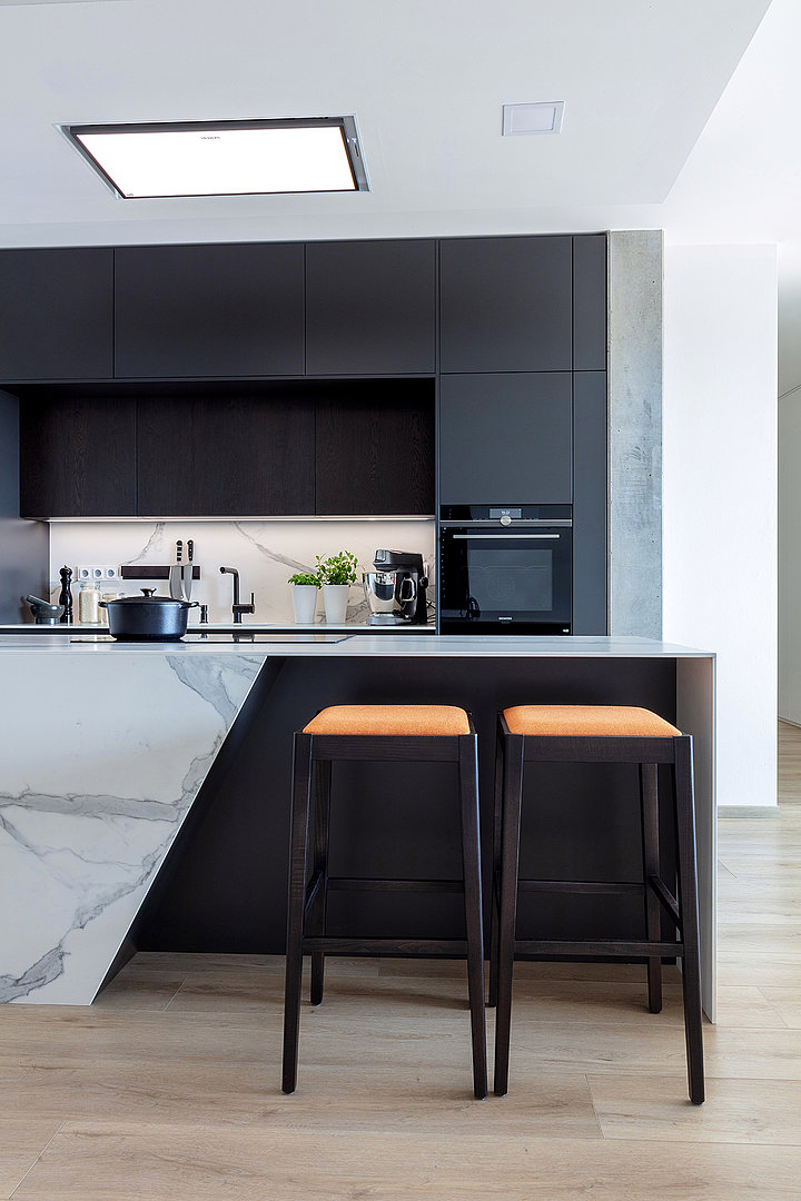 Jedná se o realizaci v bytovém domě s podzemní garáží ve Zlíně. Pro interiér bytu byla použita kombinace materiálu lak mat titan a dýhy dub americký carbon. Kuchyně je v modelu ELITE s keramickou pracovní deskou Laminam Altissimo Soft Touch. Židle u kuchyňského stolu JS33 byly vybrány v modelu NORMAN, barová židle JESS – podnože buk carbon, látka Divina 27.