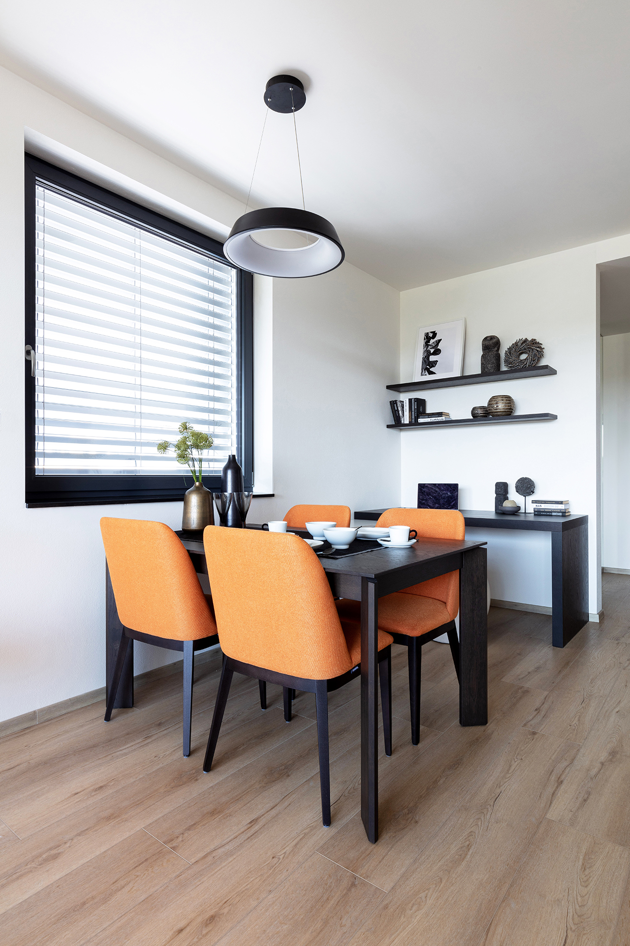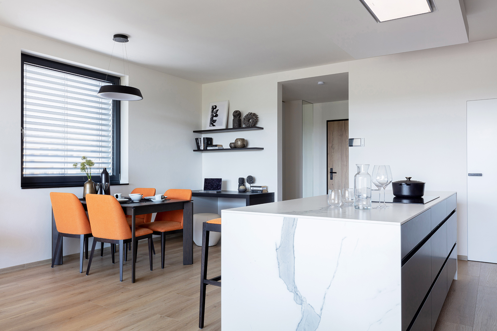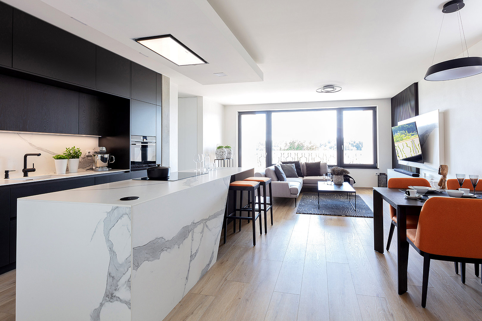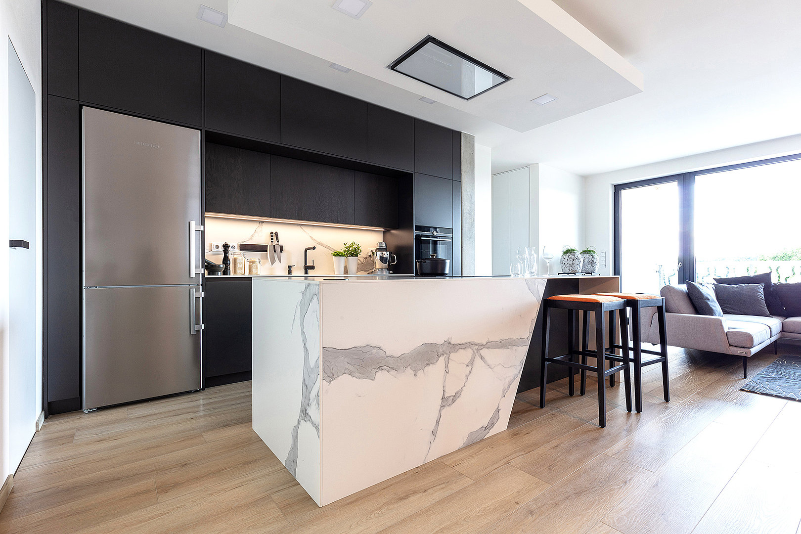 Jedná se o realizaci v bytovém domě s podzemní garáží ve Zlíně. Pro interiér bytu byla použita kombinace materiálu lak mat titan a dýhy dub americký carbon. Kuchyně je v modelu ELITE s keramickou pracovní deskou Laminam Altissimo Soft Touch. Židle u kuchyňského stolu JS33 byly vybrány v modelu NORMAN, barová židle JESS – podnože buk carbon, látka Divina 27.