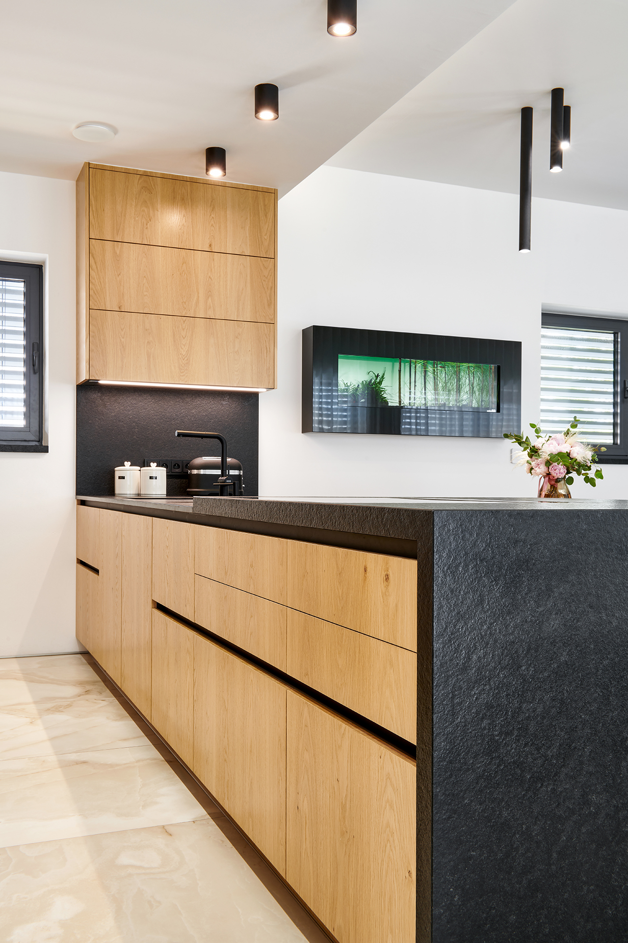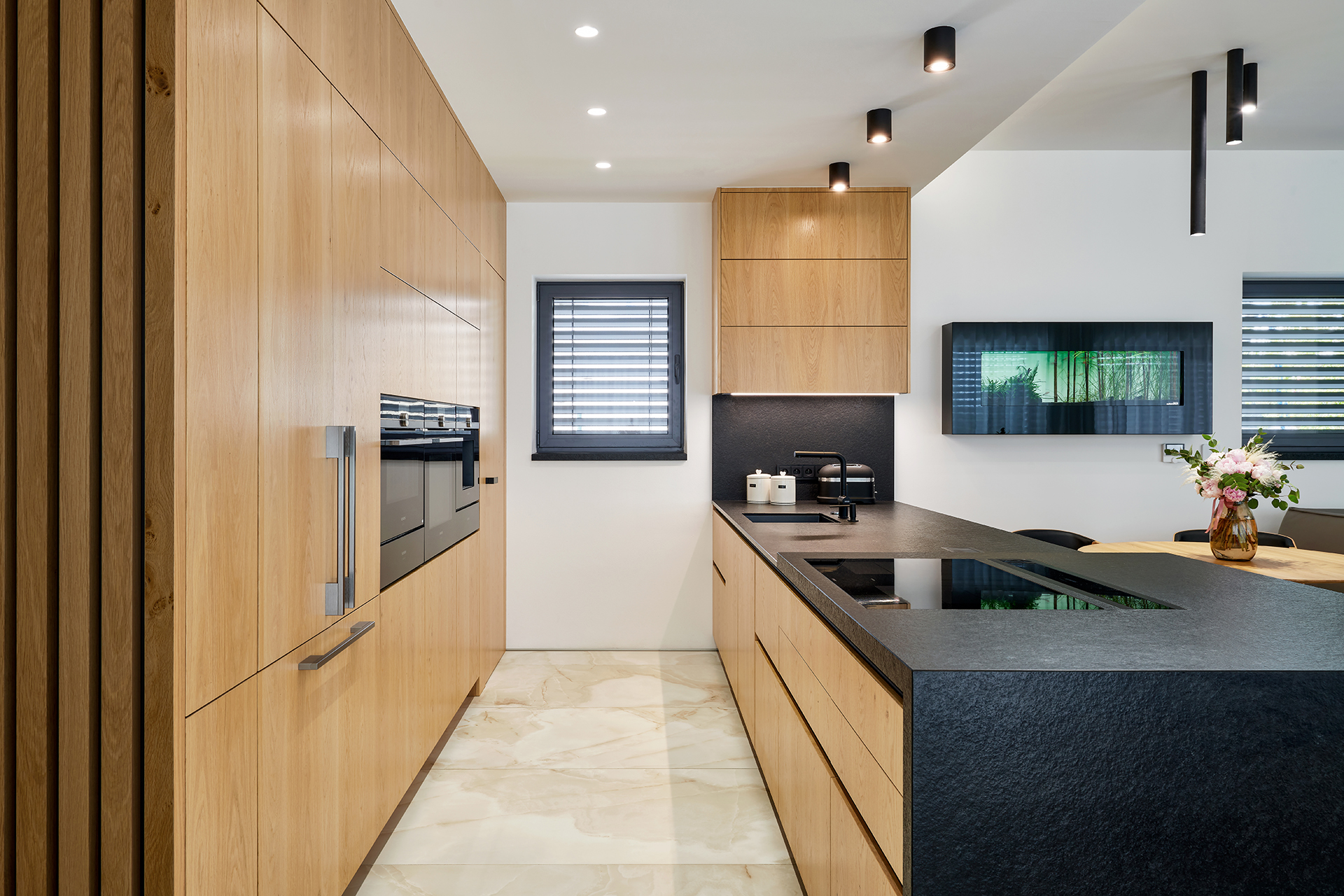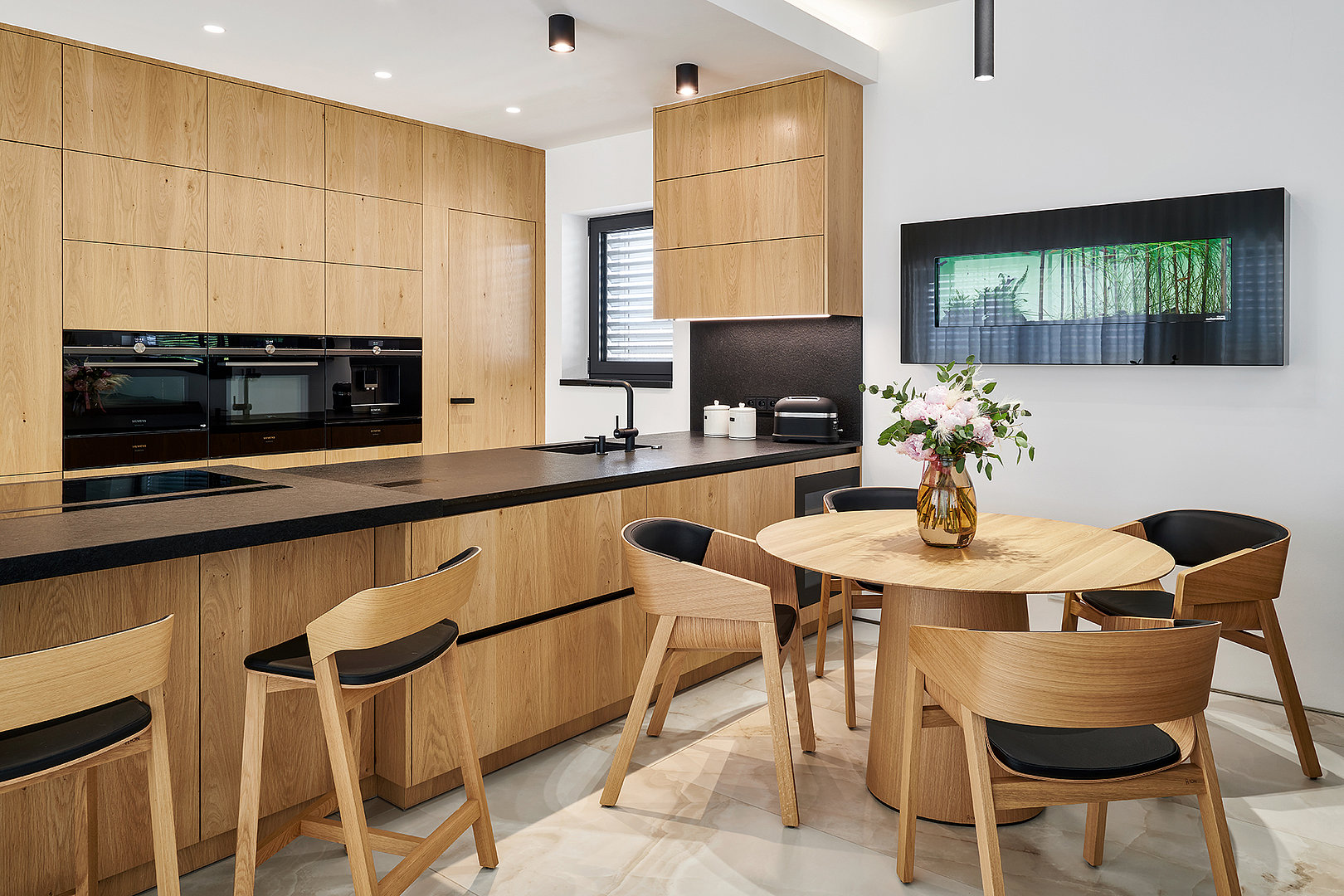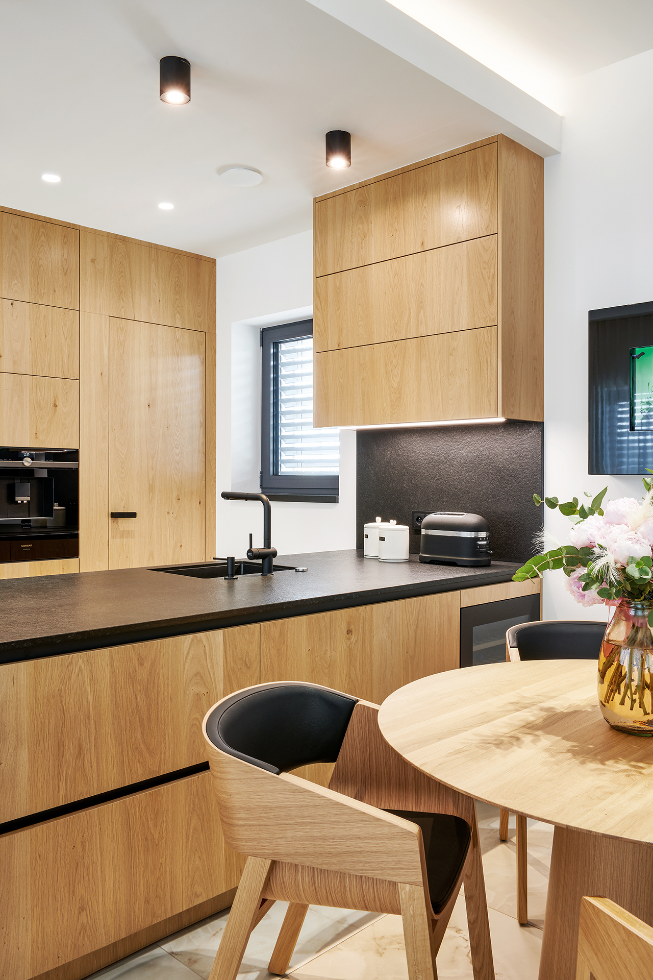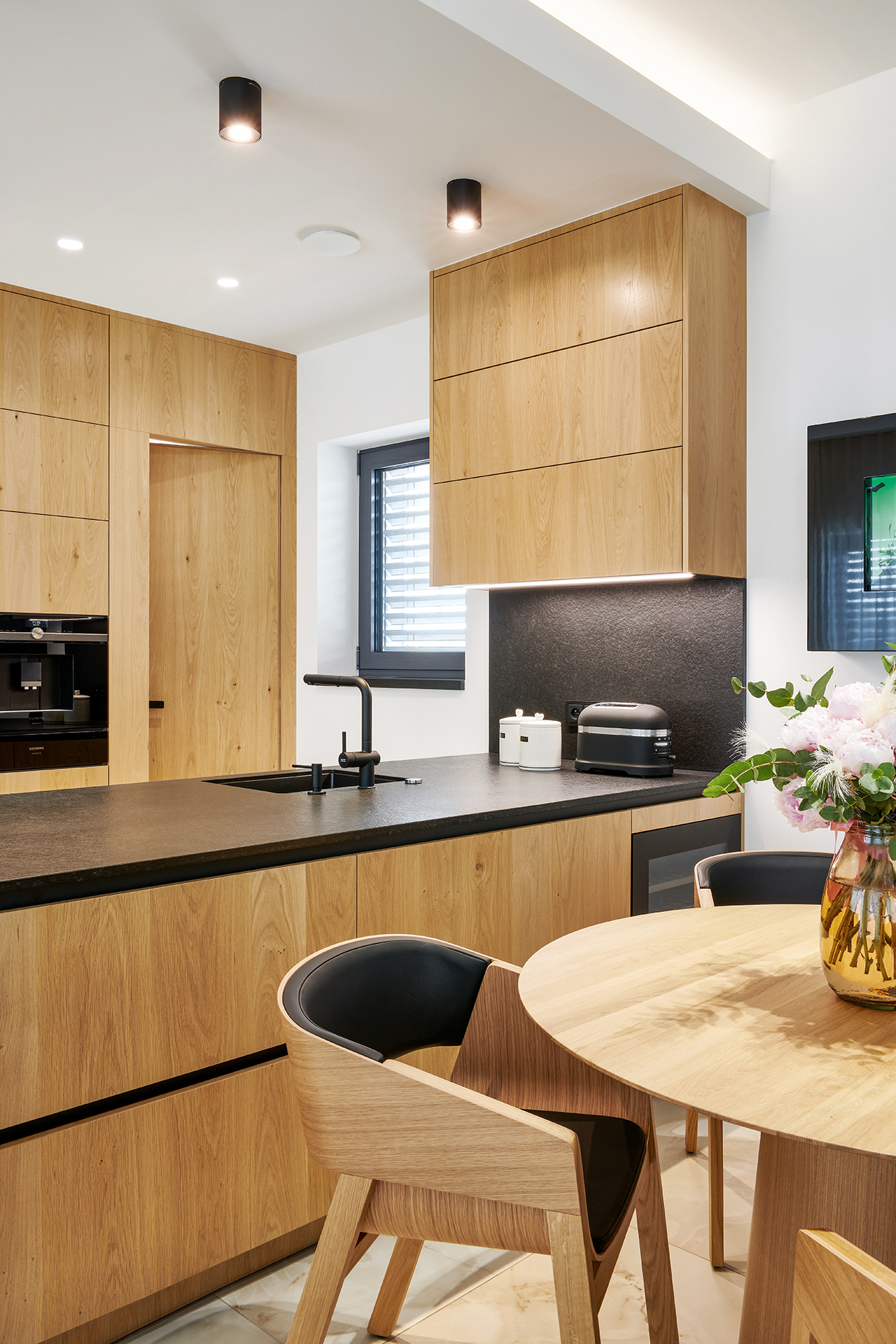 V realizaci byla použita kuchyně v provedení Premium ELITE dýha dub rustikal přírodní v návaznosti struktury dýhy na dveřích v obkladu ve vstupní hale a dveřích do sklepa. Kuchyňská linka, stůl a jídelní židle tvoří harmonický celek a dodávají místnosti příjemnou atmosféru. Pracovní deska je v materiálu žula nero assoluto antik, zajímavá je zde také vestavná lednice Siemens šířky 90 cm.