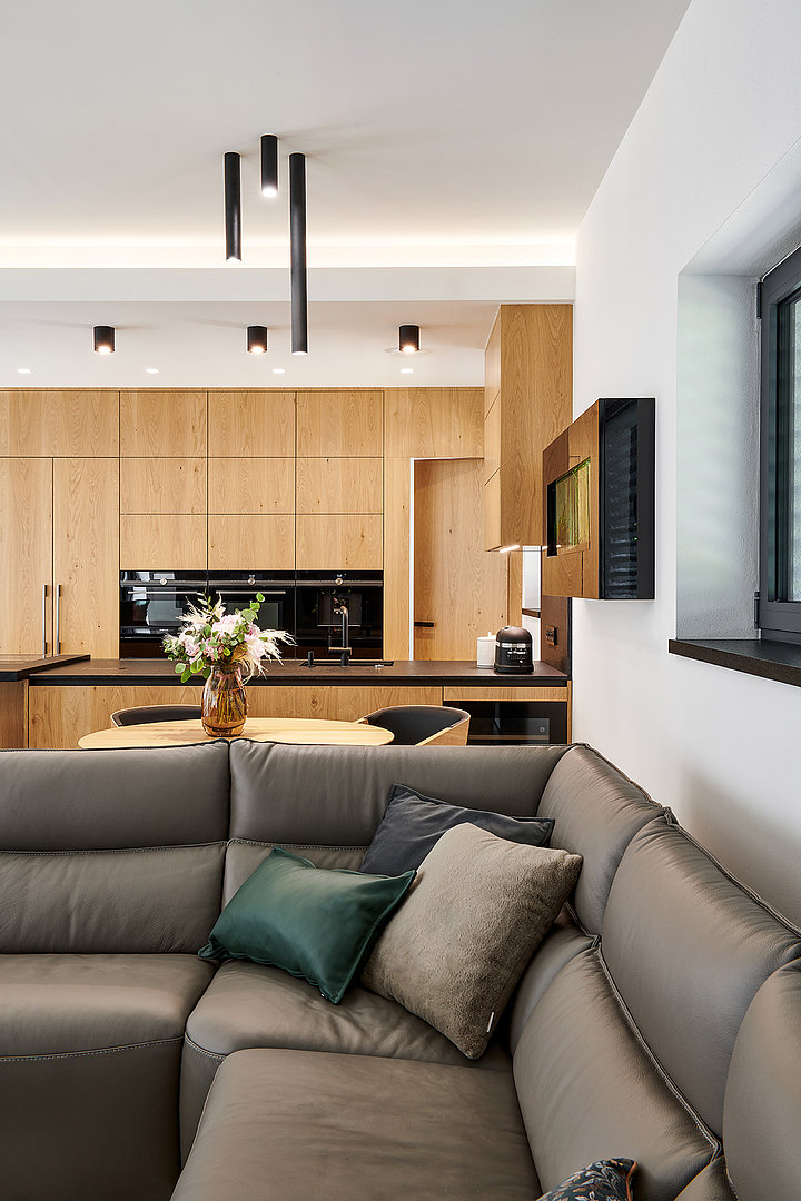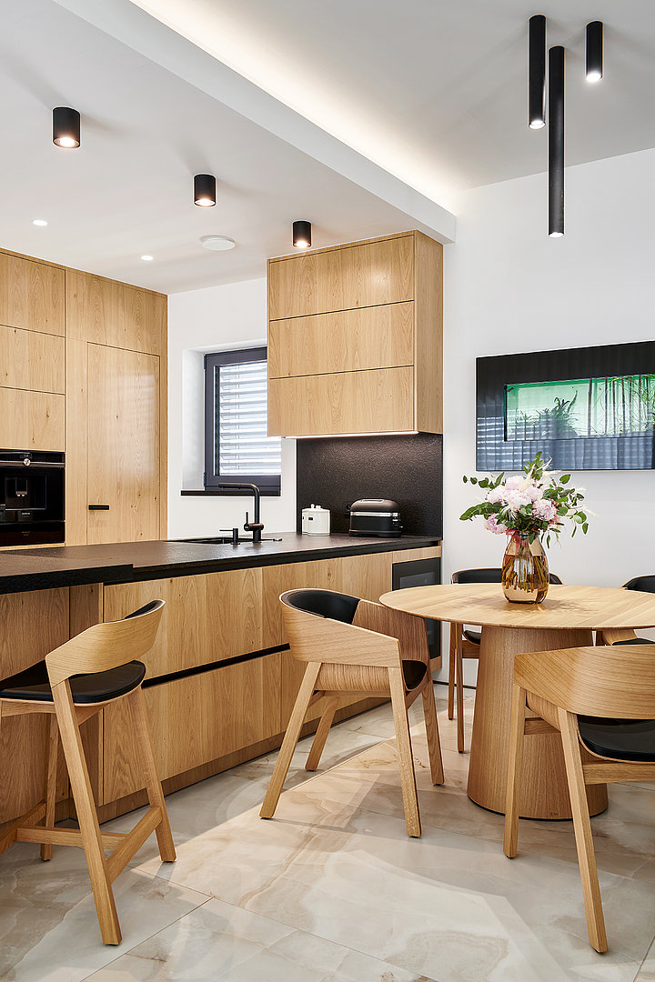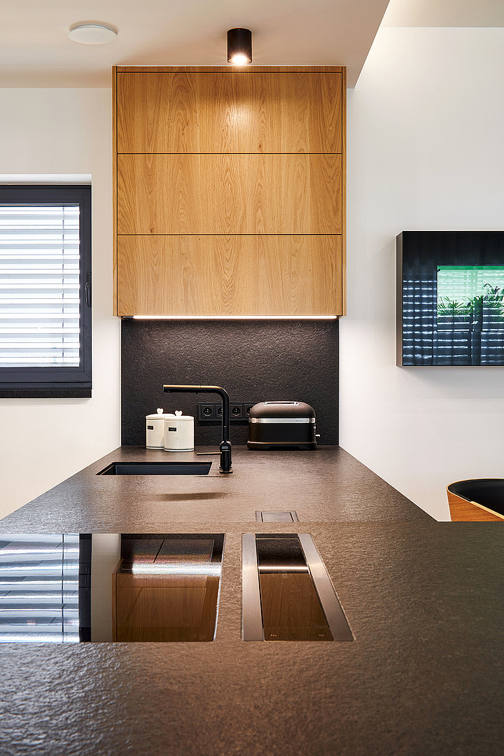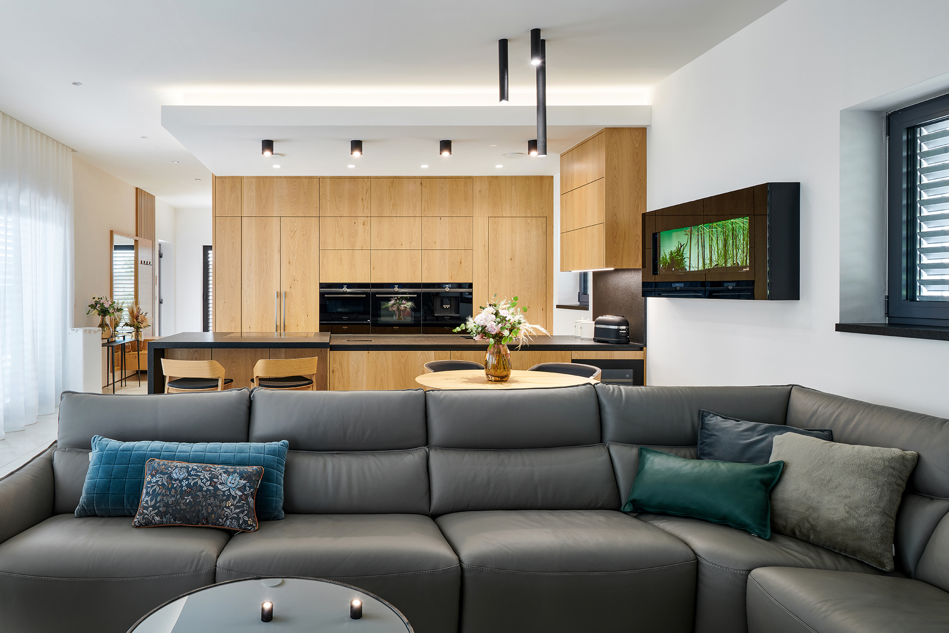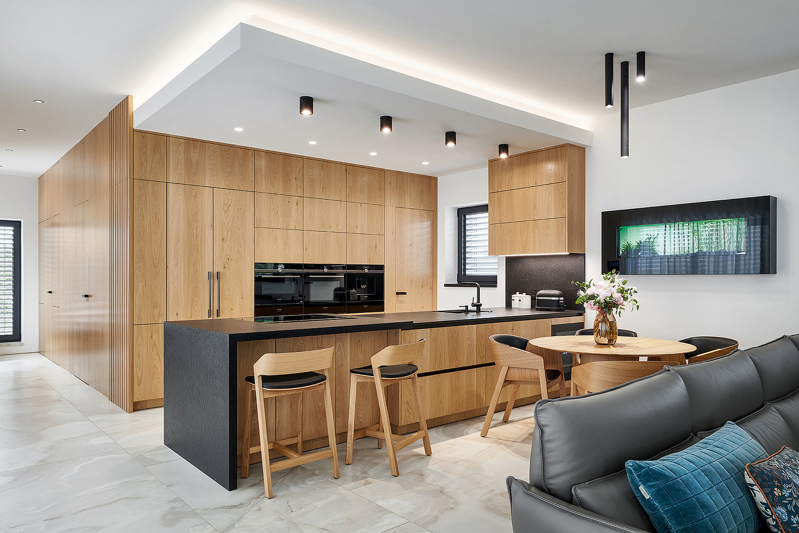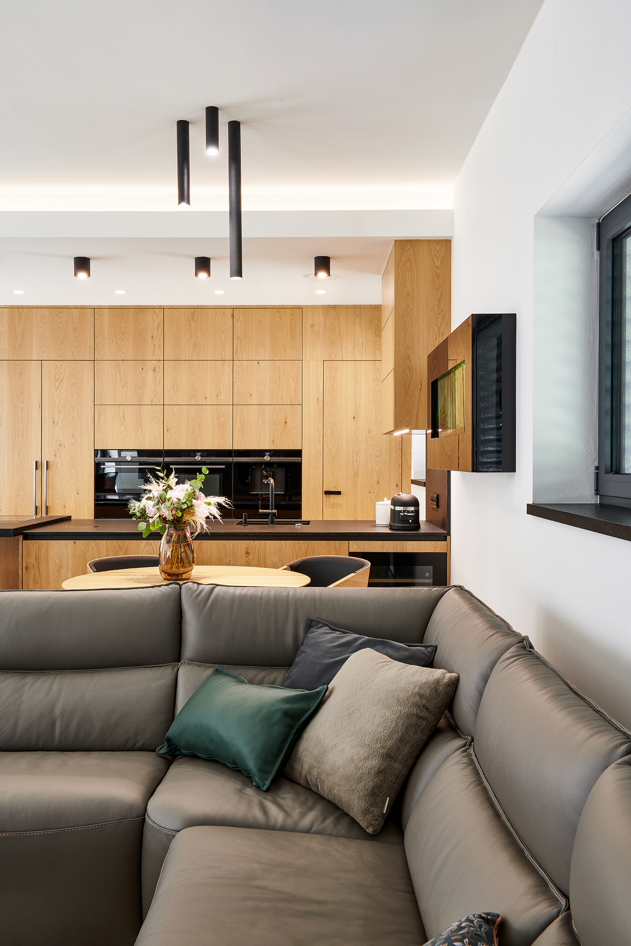 V realizaci byla použita kuchyně v provedení Premium ELITE dýha dub rustikal přírodní v návaznosti struktury dýhy na dveřích v obkladu ve vstupní hale a dveřích do sklepa. Kuchyňská linka, stůl a jídelní židle tvoří harmonický celek a dodávají místnosti příjemnou atmosféru. Pracovní deska je v materiálu žula nero assoluto antik, zajímavá je zde také vestavná lednice Siemens šířky 90 cm.