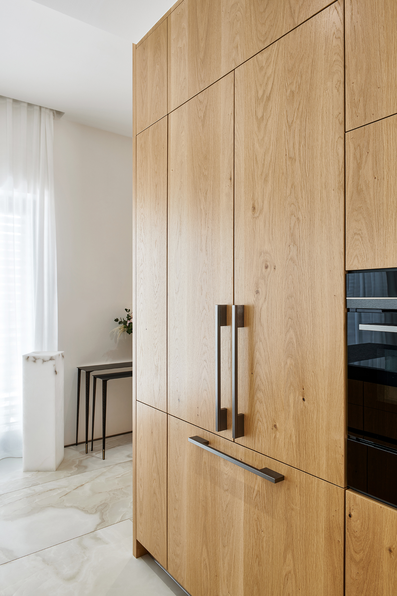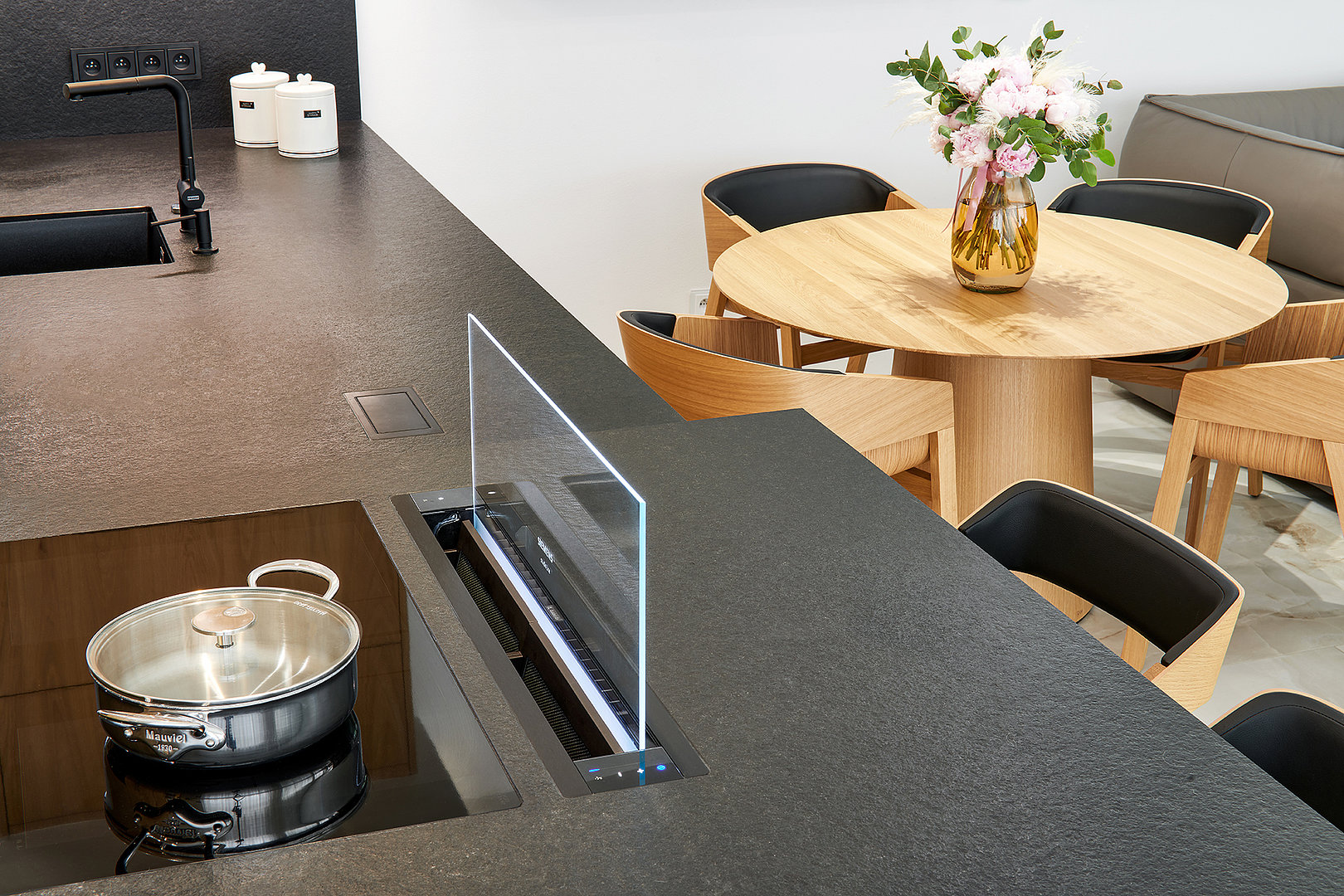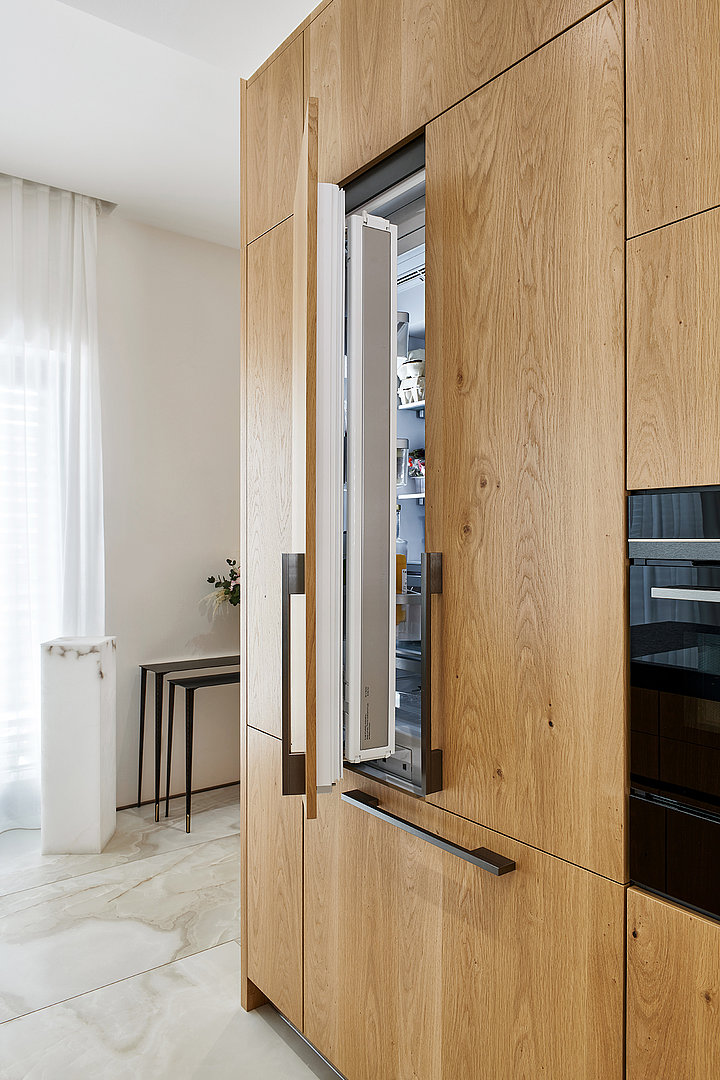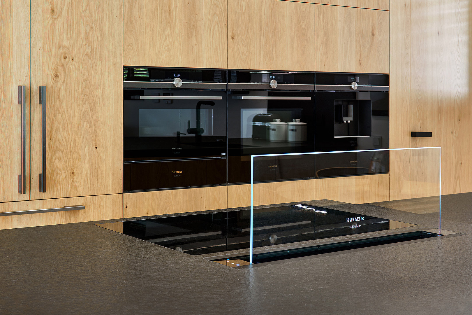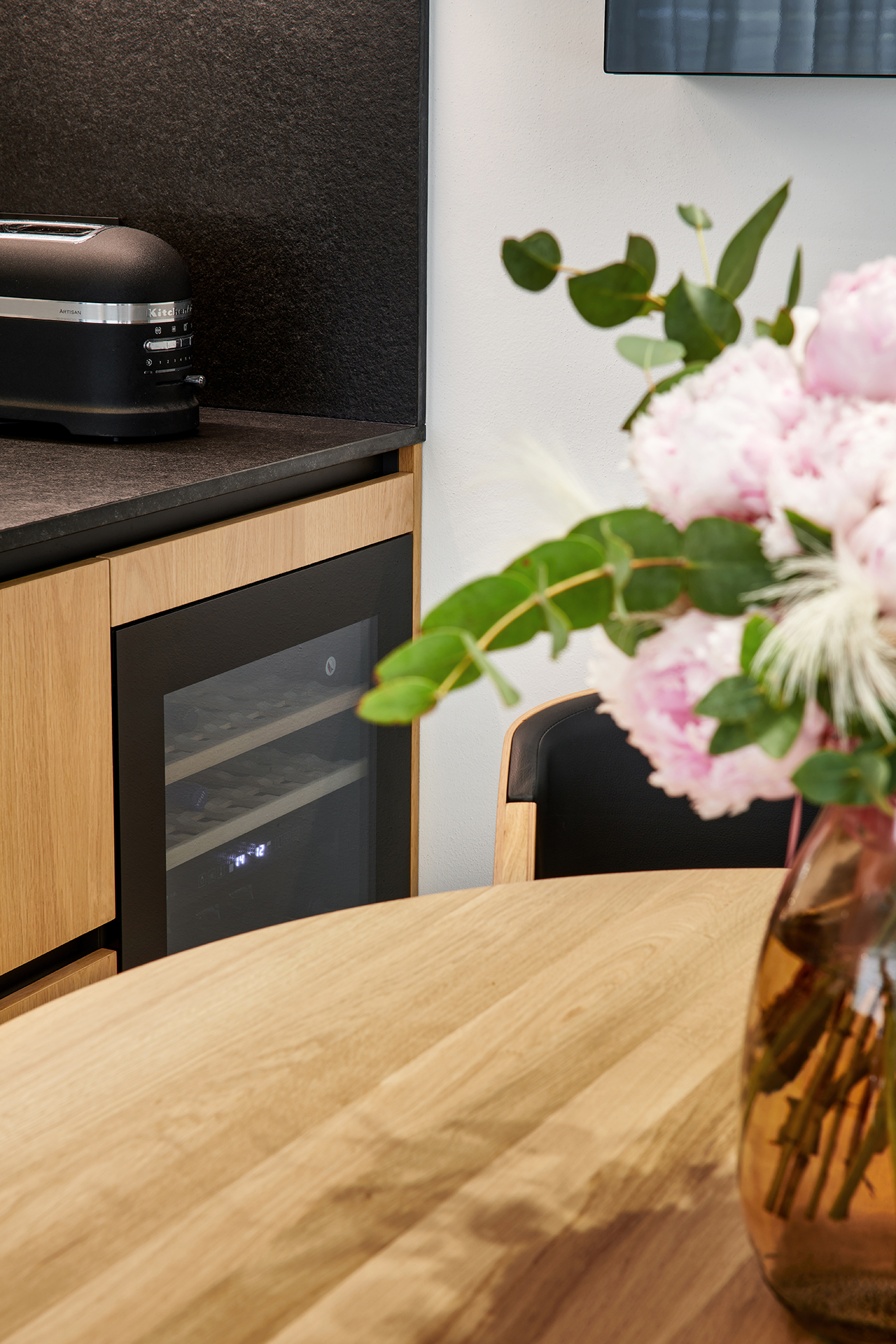 V realizaci byla použita kuchyně v provedení Premium ELITE dýha dub rustikal přírodní v návaznosti struktury dýhy na dveřích v obkladu ve vstupní hale a dveřích do sklepa. Kuchyňská linka, stůl a jídelní židle tvoří harmonický celek a dodávají místnosti příjemnou atmosféru. Pracovní deska je v materiálu žula nero assoluto antik, zajímavá je zde také vestavná lednice Siemens šířky 90 cm.