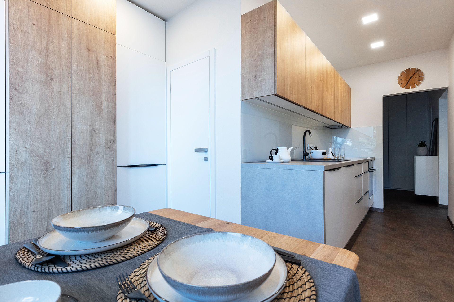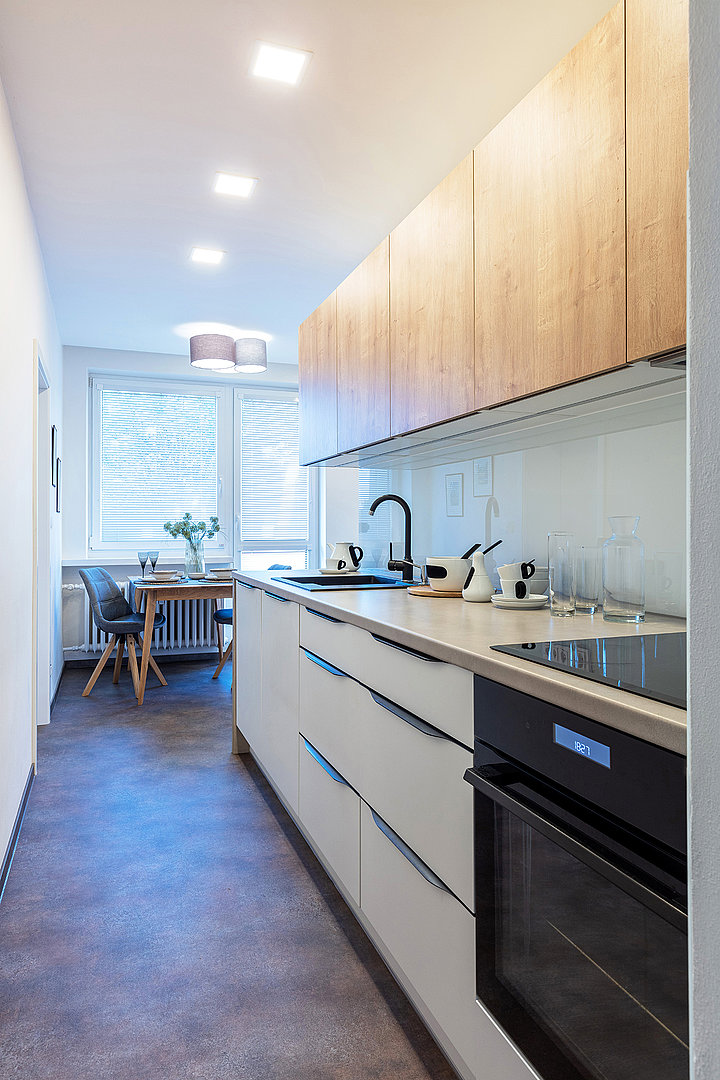 Představujeme vám velmi zdařilou realizaci interiéru v rekonstruovaném bytě o dispozici 3+1. Kuchyně v realizaci byla zvolena v modelu COMFORT bílá lak mat kombinace s laminátem dub rustikál přírodní.