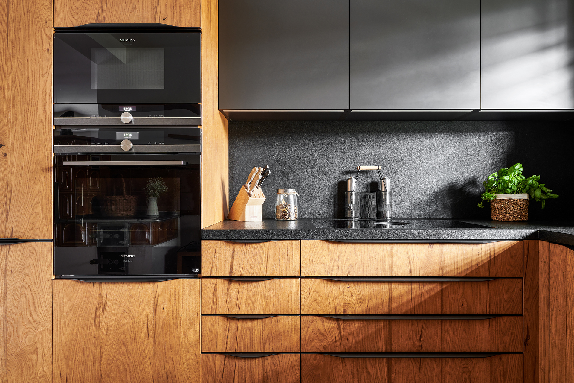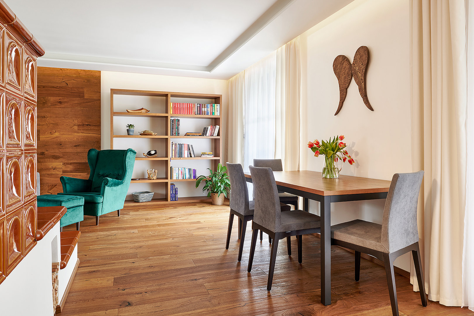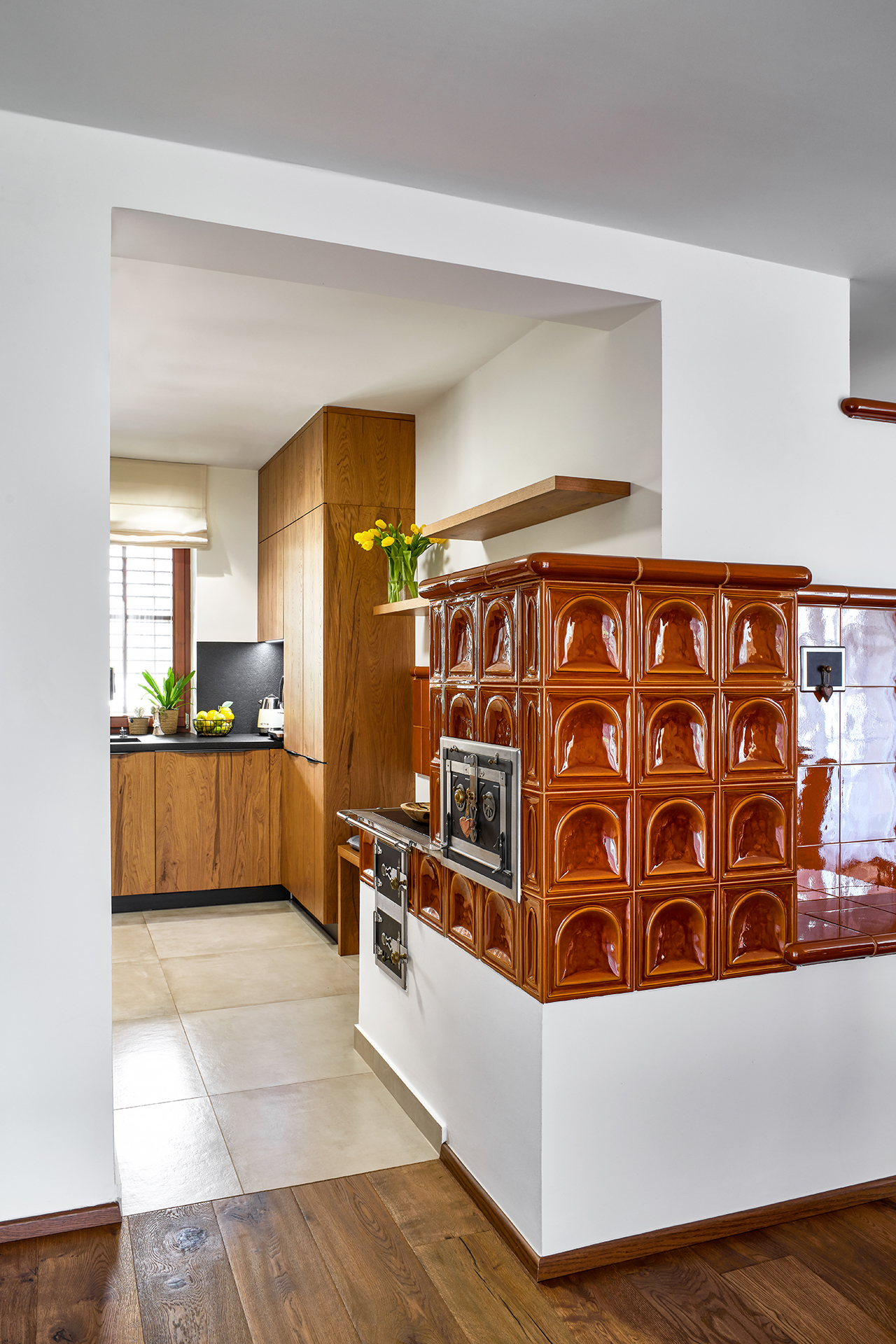 Představujeme vám dokonale provedenou realizaci interiéru rodinného domu se zachováním myšlenky Interior Concept. Požadavek investora byl zachovat charakter s kachlovými kamny a celkově design interiéru zmodernizovat, což se velmi podařilo. Hlavními použitými materiály byly bezesporu prémiová dýha dub selský, lak titan star mat a dubová podlaha Kährs. Kuchyňská linka byla pro tuto realizaci vybrána v modelu COMFORT, lak titan star mat, dýha dub selský, pracovní deska žula nero Zimbabwe. Spotřebiče si investor vybral od výrobce Siemens v řadě Studio-Line. Jídelní stůl byl zvolen v modelu JS02 a k nim velmi vkusně sladěné židle, které jsou v modelu LAURA.