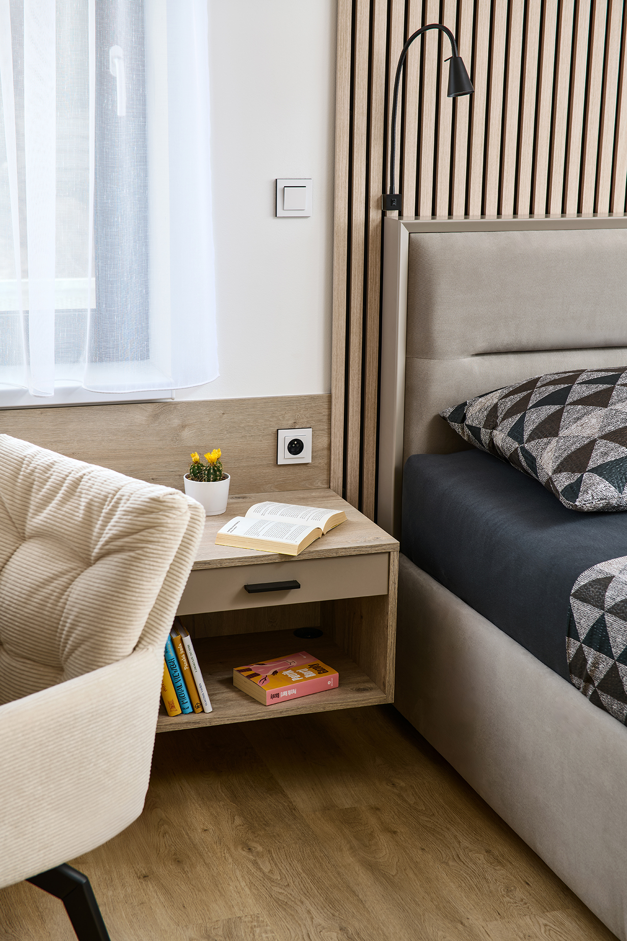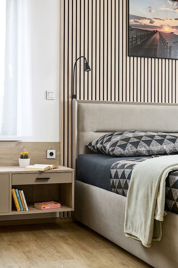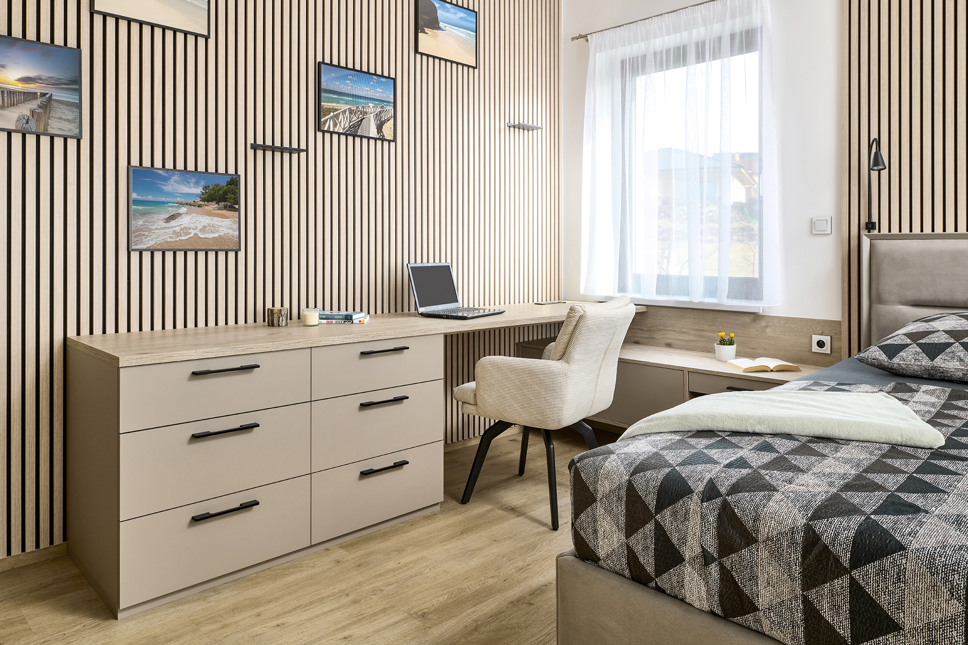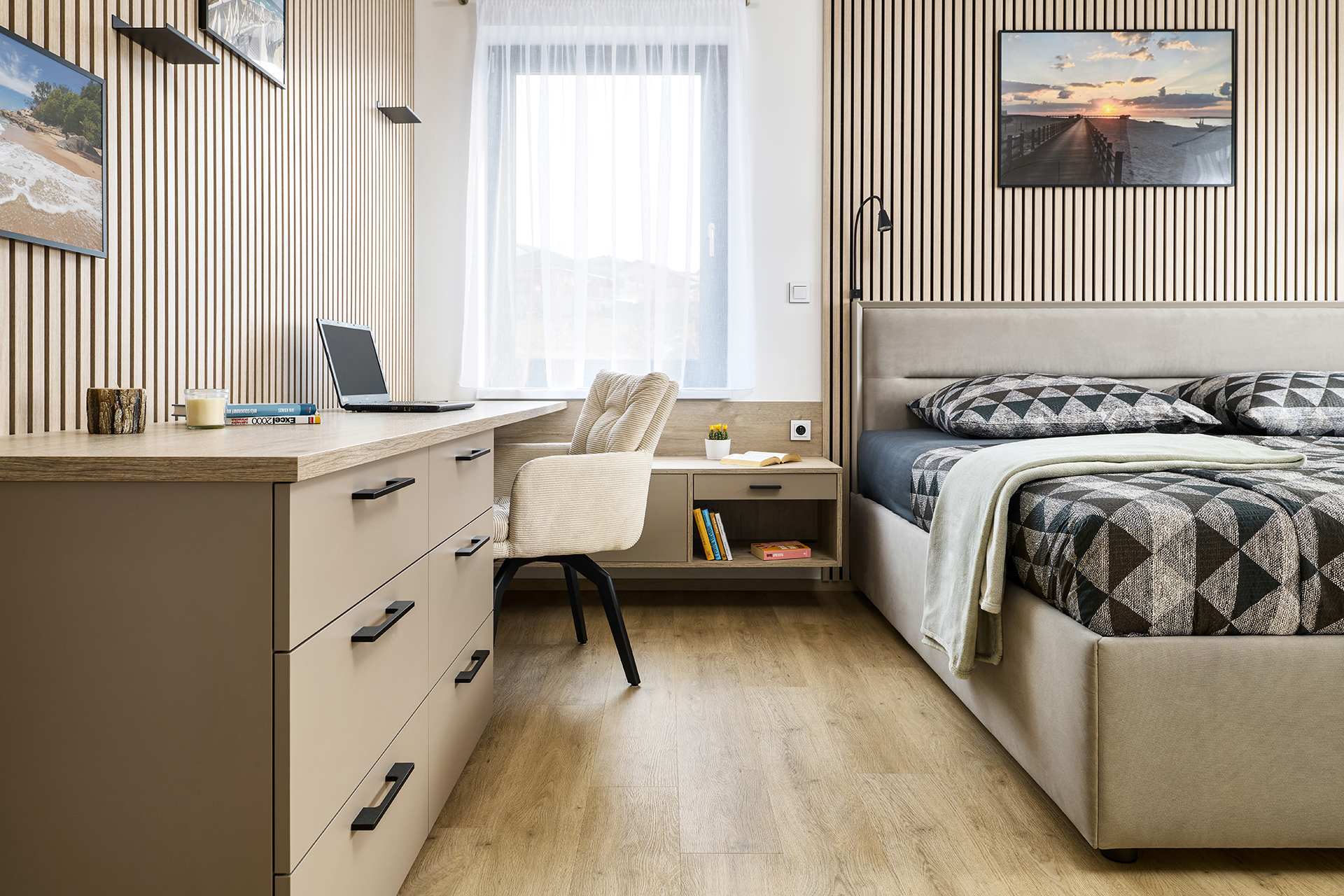 Útulná atmosféra ložnice vzniká díky promyšlené kombinaci přírodních tónů a jemných detailů. Šatní skříň OPTIMA v dekoru dub sukatý, doplněná jemnou barvou cashmere, vnáší do prostoru přirozené teplo a svým designem i úložným prostorem obohacuje ložnici o praktickou i estetickou hodnotu. Hlavním prvkem místnosti je čalouněná postel MADISON, která je nejen pohodlná, ale i stylová – ideální pro večerní relaxaci a ničím nerušený odpočinek.