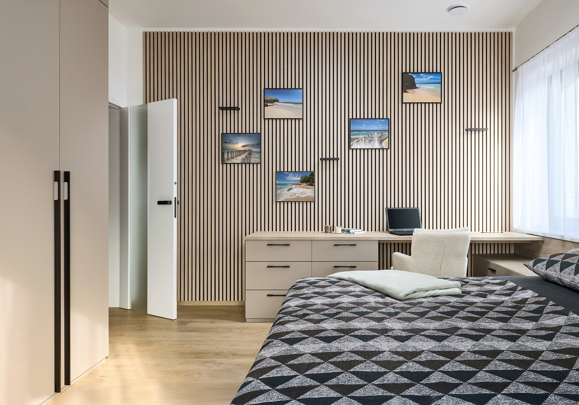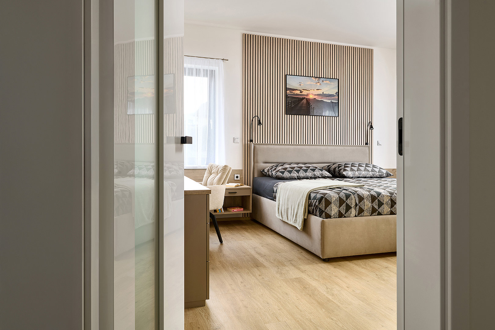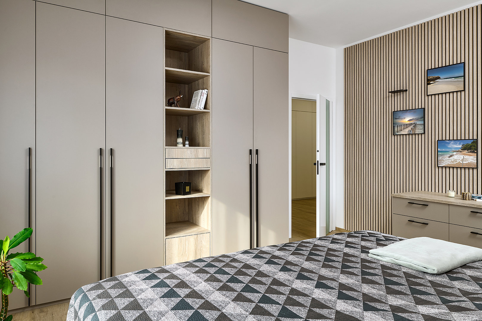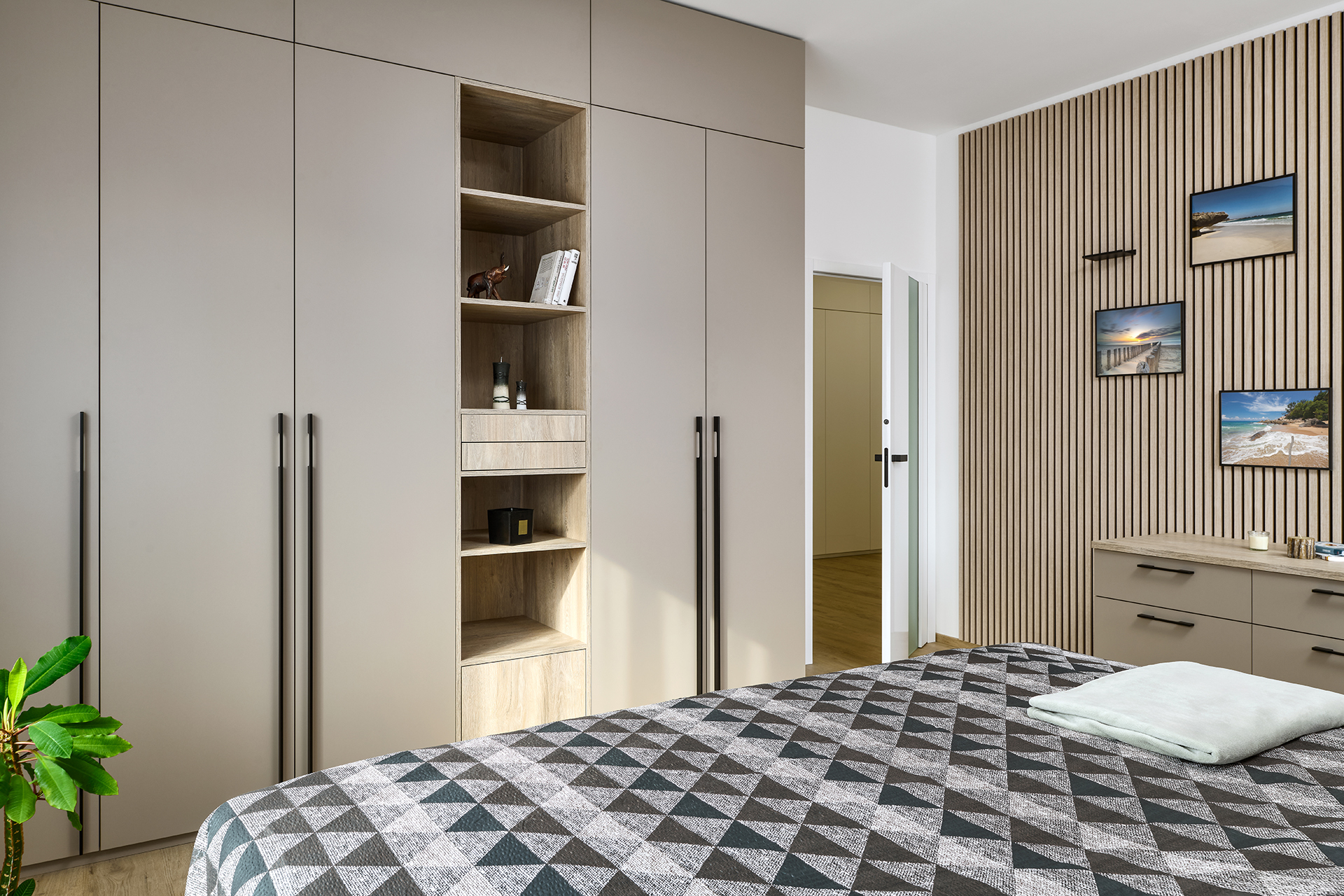 Útulná atmosféra ložnice vzniká díky promyšlené kombinaci přírodních tónů a jemných detailů. Šatní skříň OPTIMA v dekoru dub sukatý, doplněná jemnou barvou cashmere, vnáší do prostoru přirozené teplo a svým designem i úložným prostorem obohacuje ložnici o praktickou i estetickou hodnotu. Hlavním prvkem místnosti je čalouněná postel MADISON, která je nejen pohodlná, ale i stylová – ideální pro večerní relaxaci a ničím nerušený odpočinek.