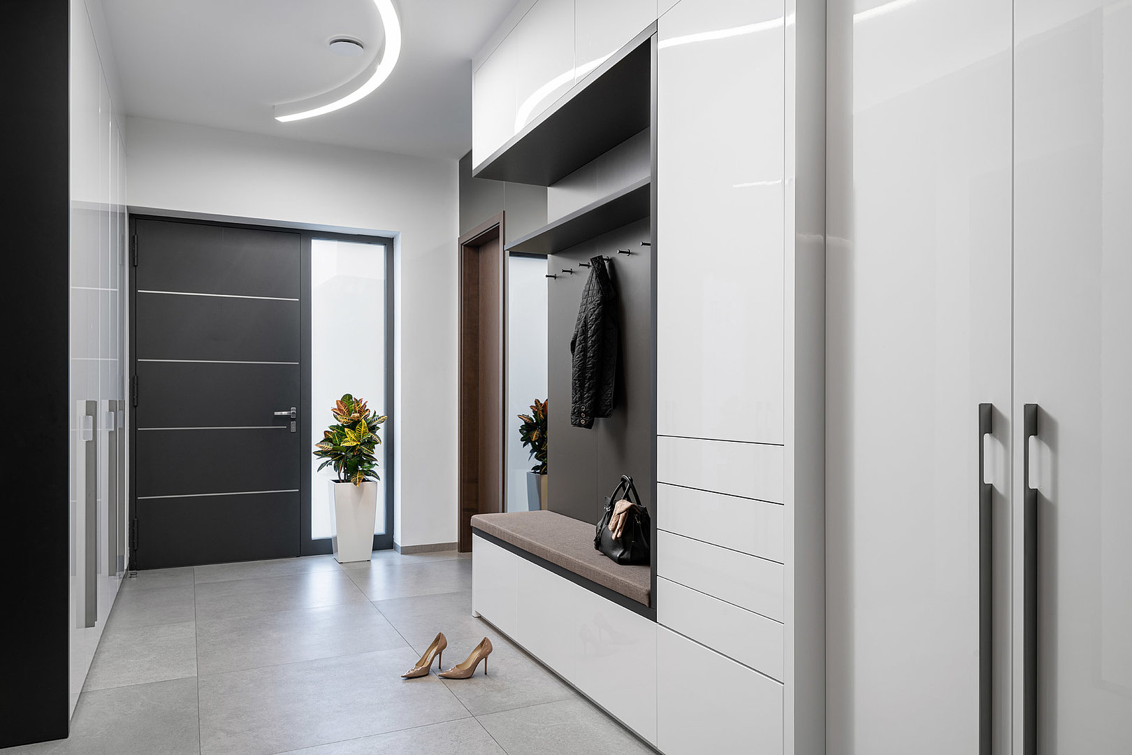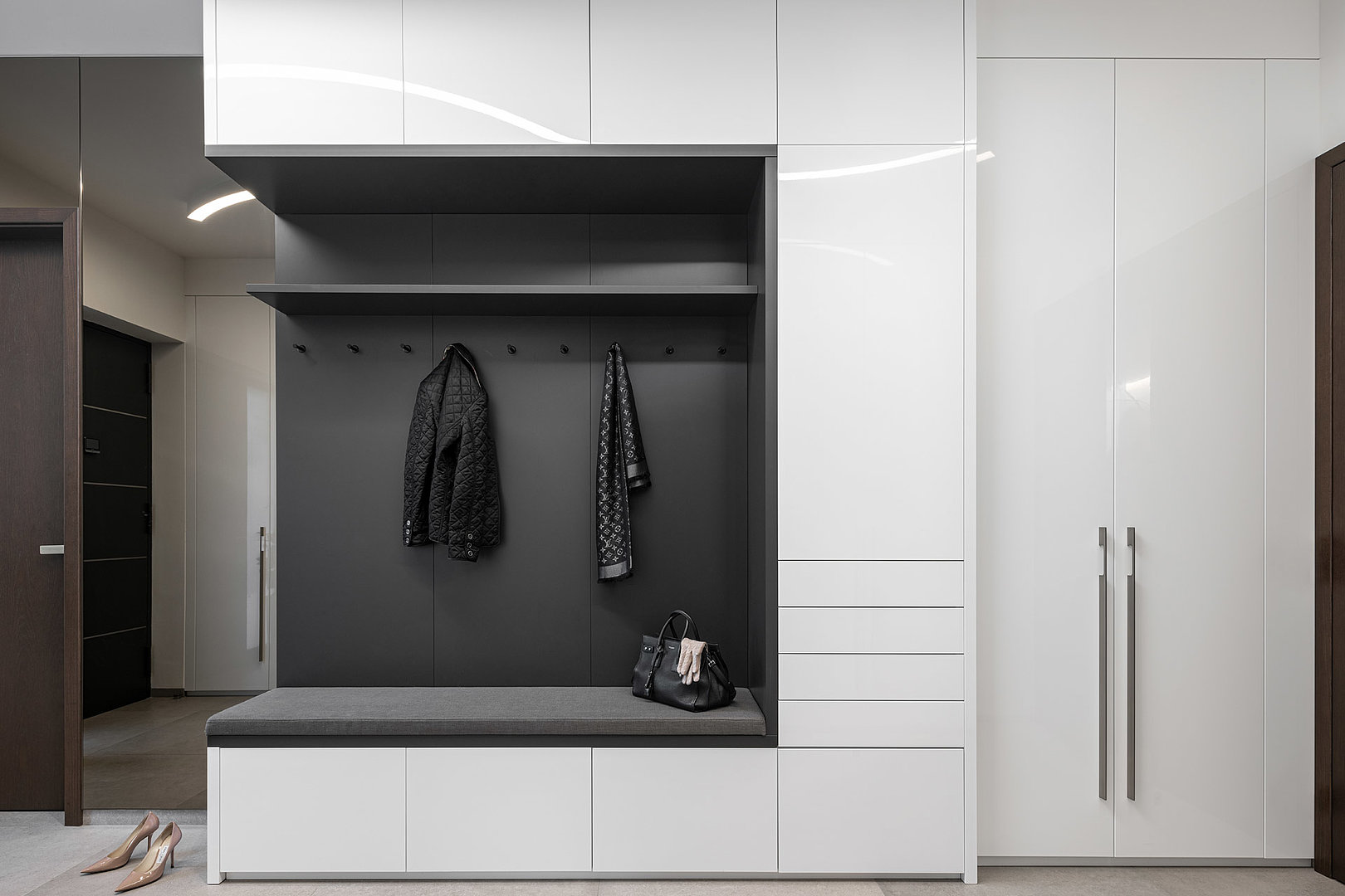 Úložné prostory, nekonečné téma každého bydlení. V této realizaci jsou kromě samostatných šaten řešeny také šatní skříně, a to v celém domě. Pro sjednocení a elegantní vzhled, byl zvolen bílý lak v lesku, který koresponduje i s ostatním interiérovým nábytkem.