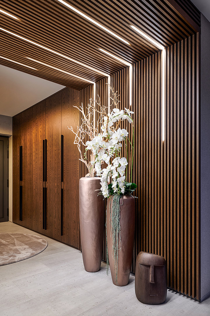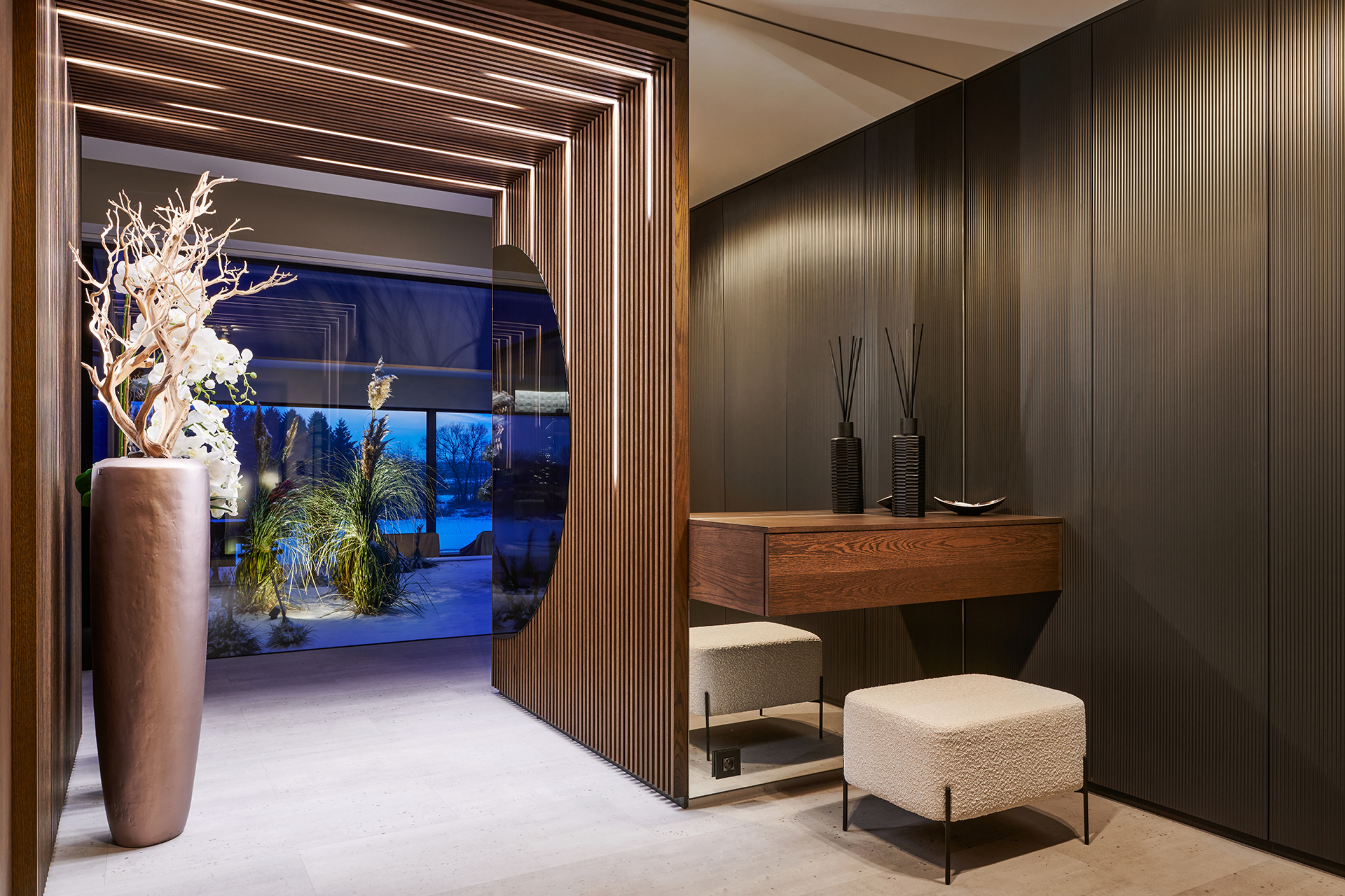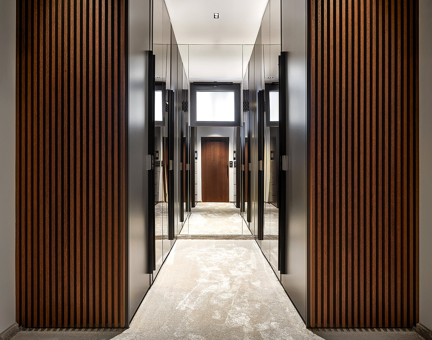 Dokonalé a naprosto přesné napojení dýhovaných lamel s osvětlením, včetně zapuštěného zrcadla, které je jejich součástí. Lamely přechází z jedné strany místnosti po stropu na druhou a vytváří velmi zajímavý efekt v interiéru. Skříně s drážkováním WAVE navazují na tento design a podtrhují jedinečnost celého domu.