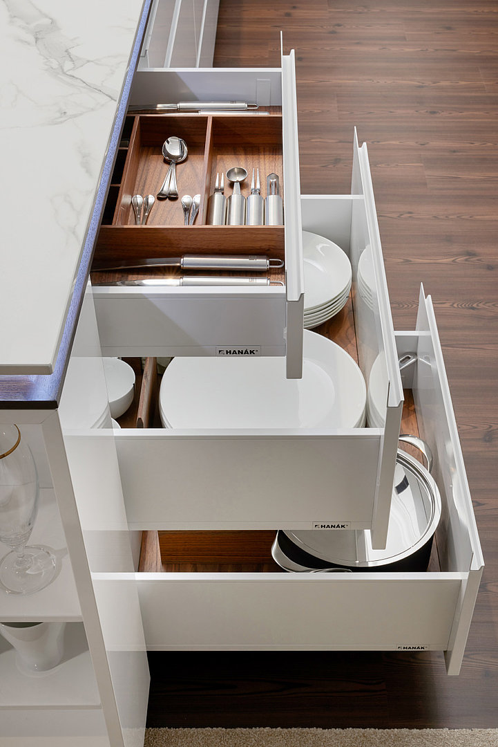 Další ze zástupců oblíbených bílých lakovaných kuchyní. Prémiový 7vrstvý lak HANÁK dostává v této rozsáhlé sestavě nábytku přecházející až do obývacího pokoje opravdu velkou plochu k tomu, aby vynikl v plné své kráse.