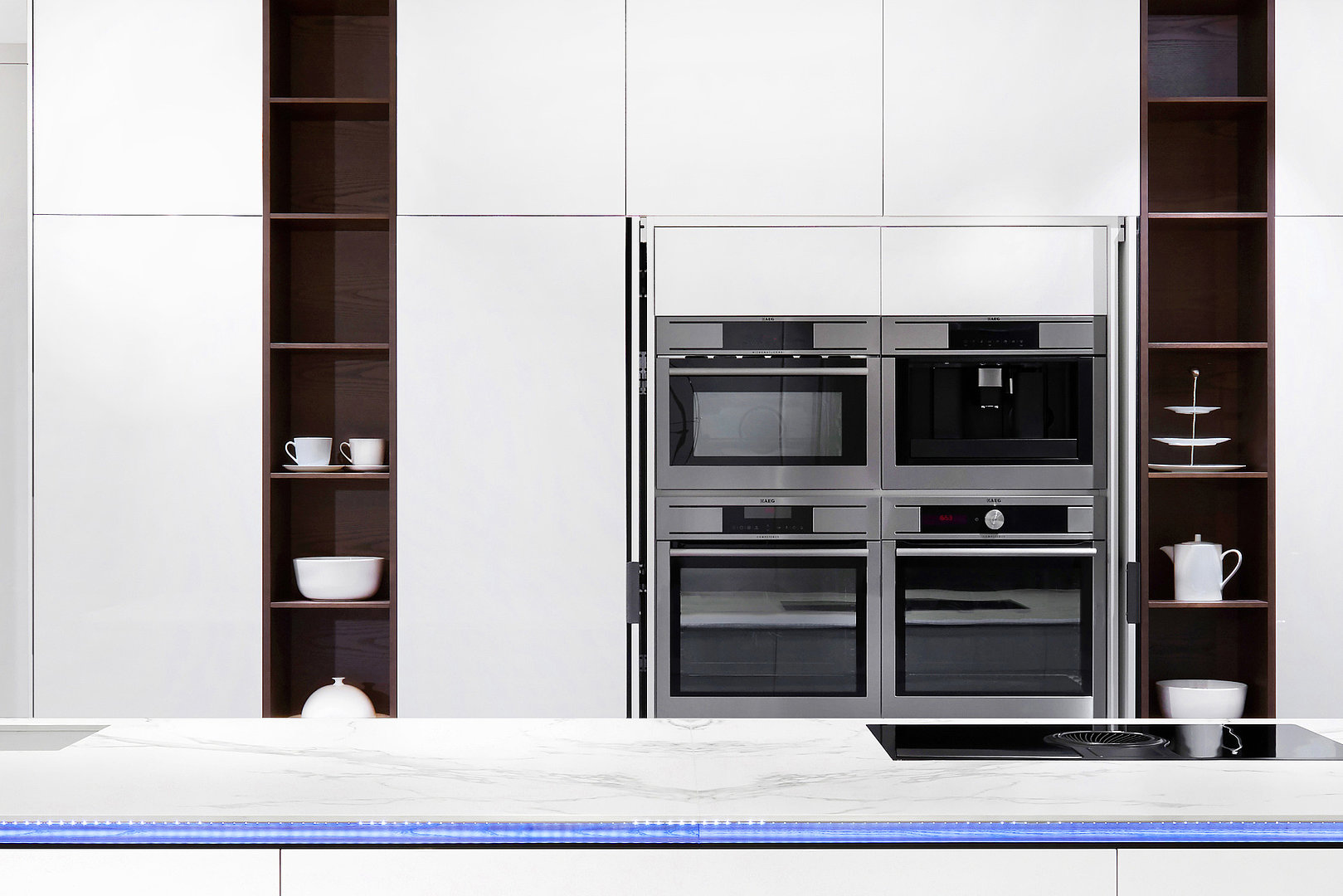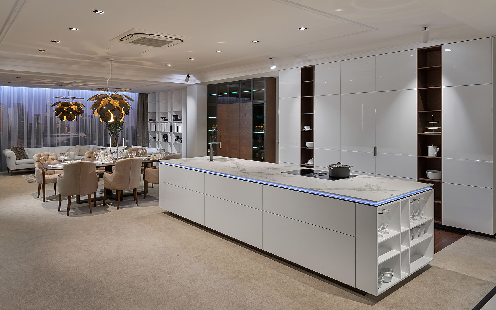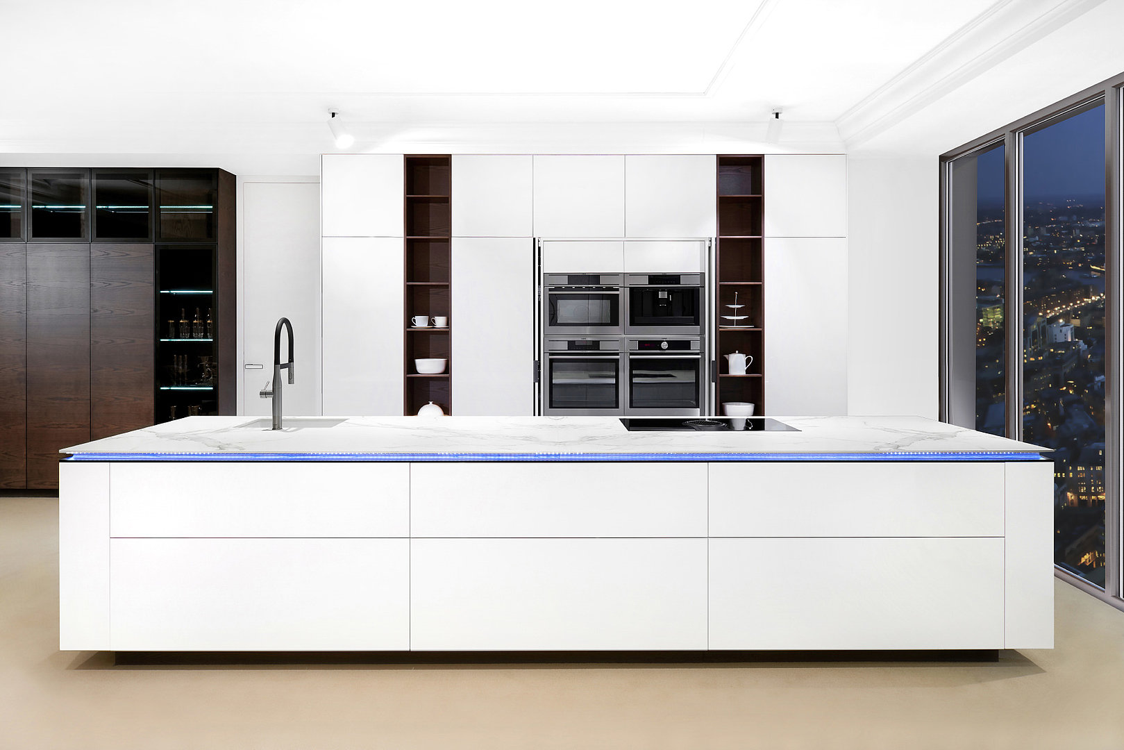 Sněhově bílá kuchyně LINE/SIMPLE s dominantním ostrůvkem