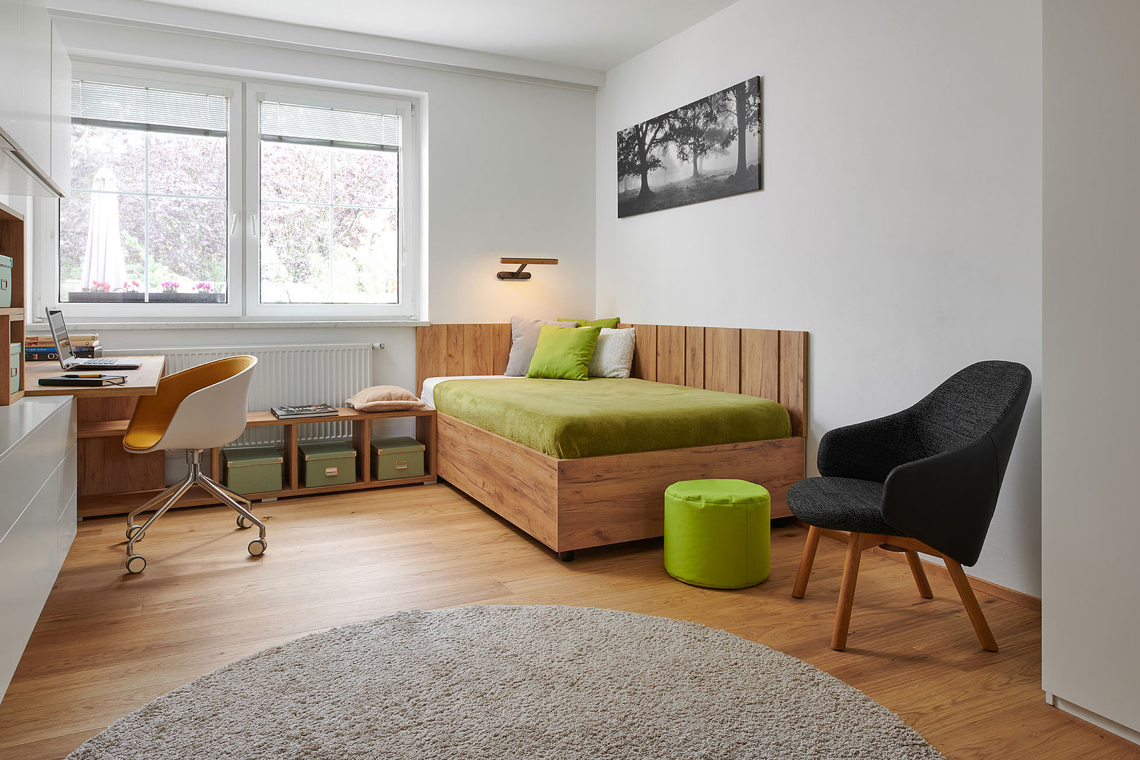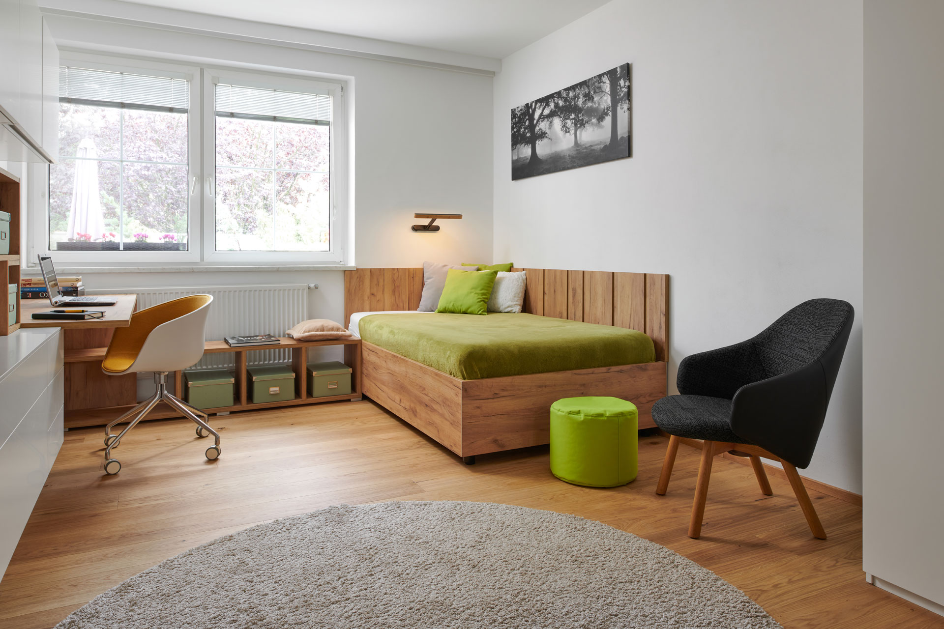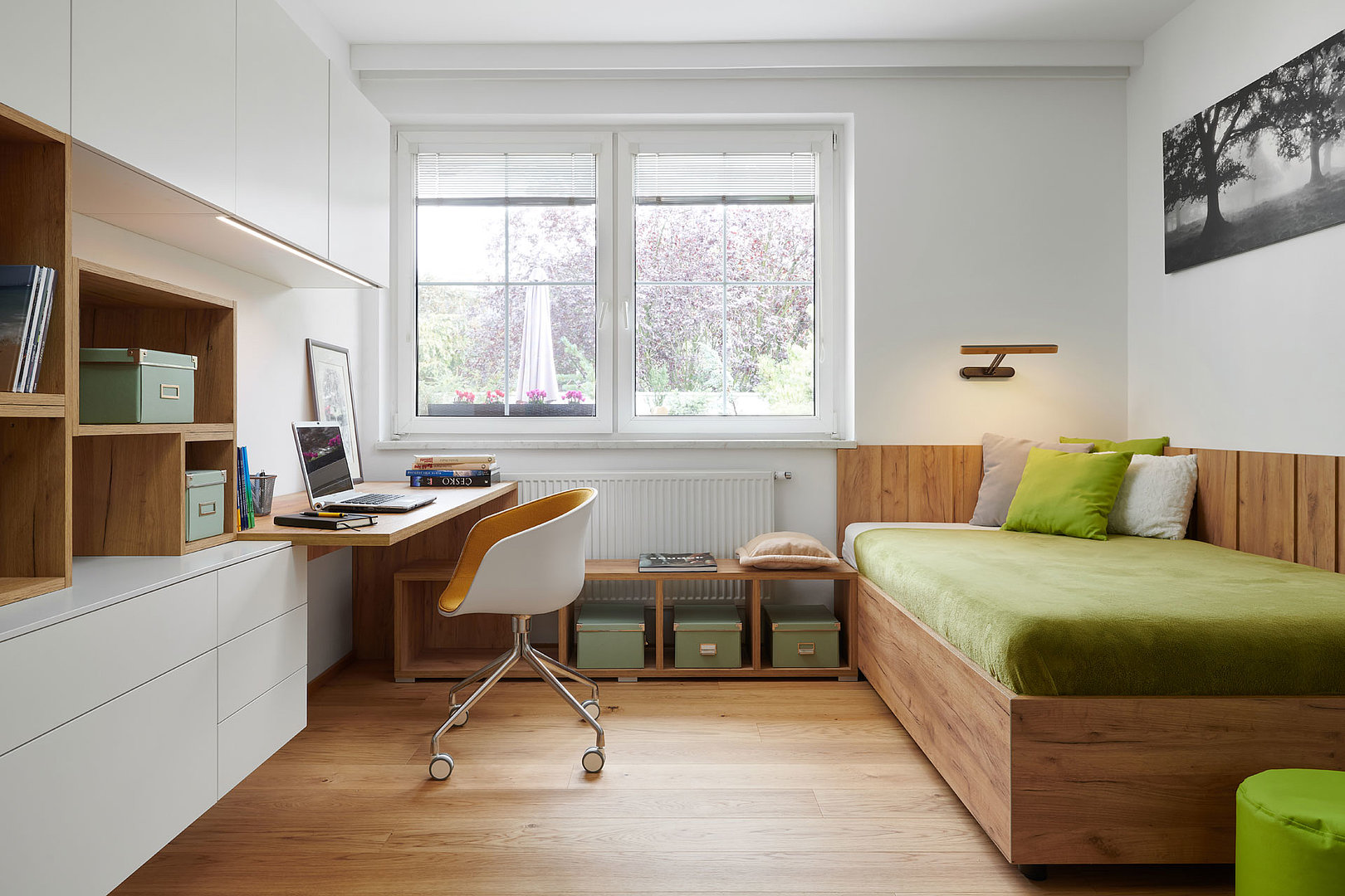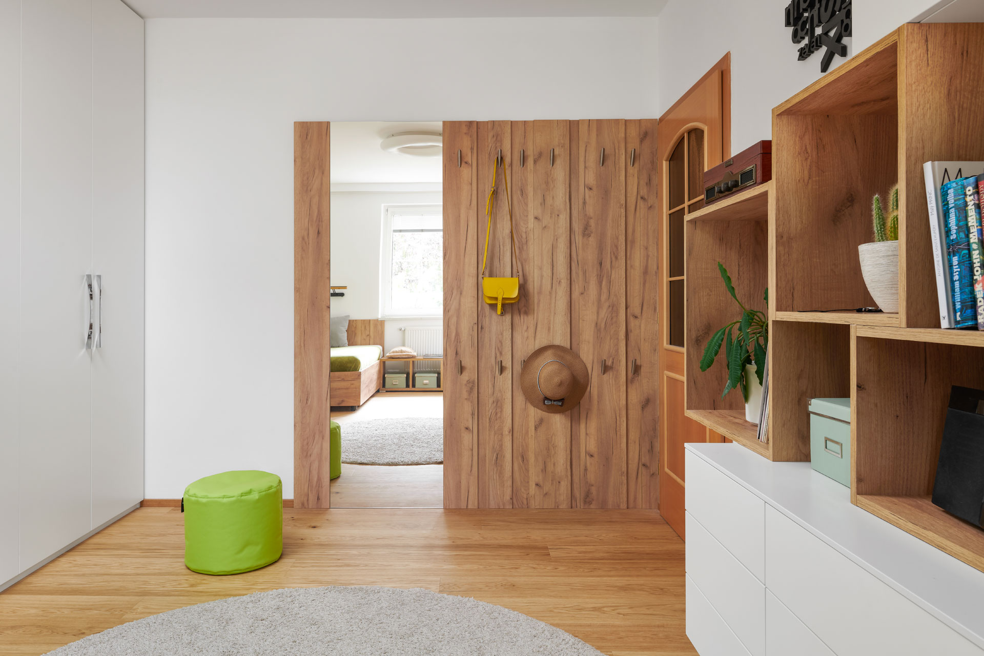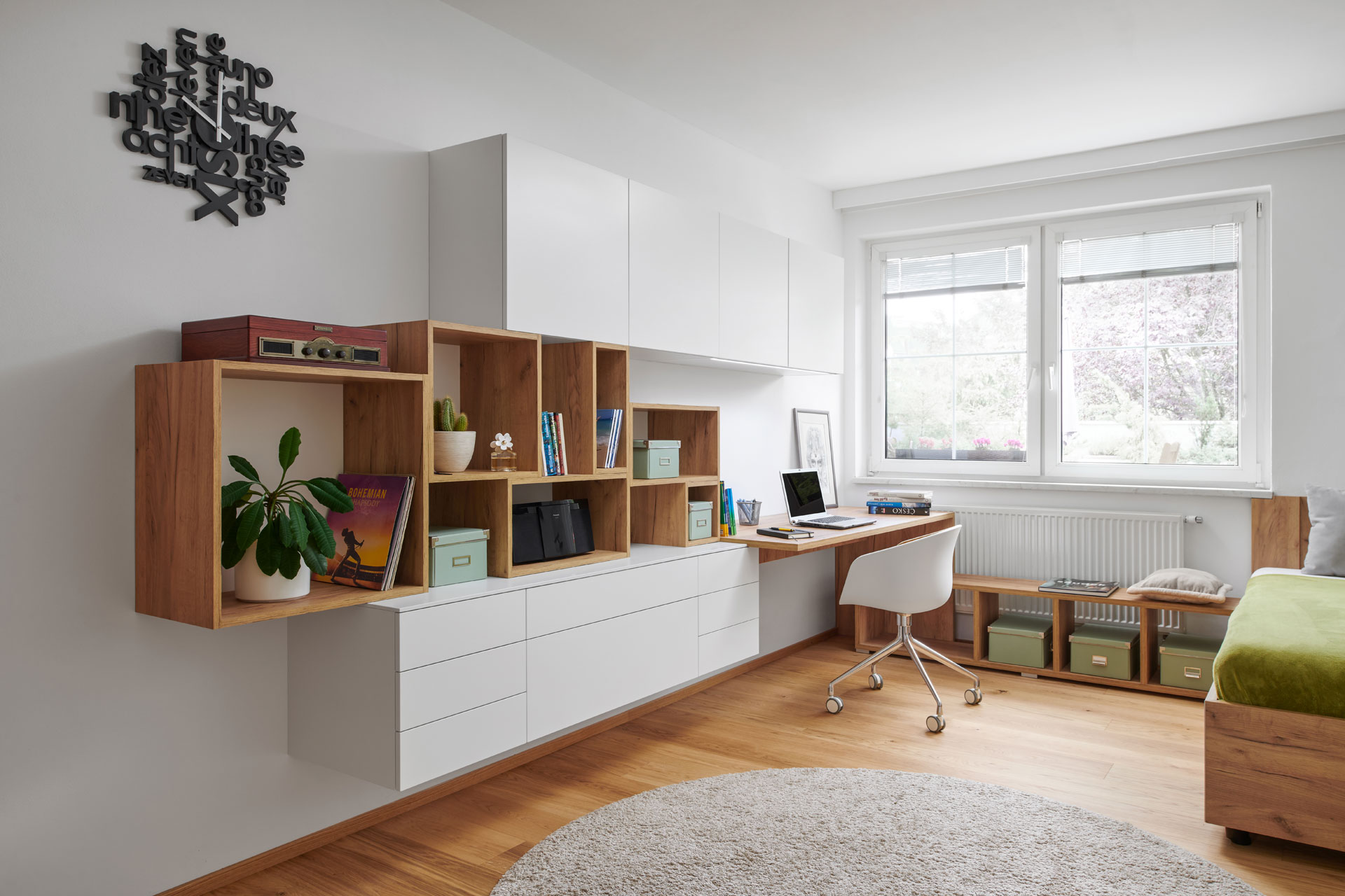 Realizace studentského pokoje v nadčasovém designu, kde projektantka navrhla profilovaný obklad stěny. Použila ho nejen za postel, ale slouží i jako věšáková stěna k odložení oblečení. Vkusná a zároveň hravá je sestava skříněk a otevřených nik u pracovní plochy.