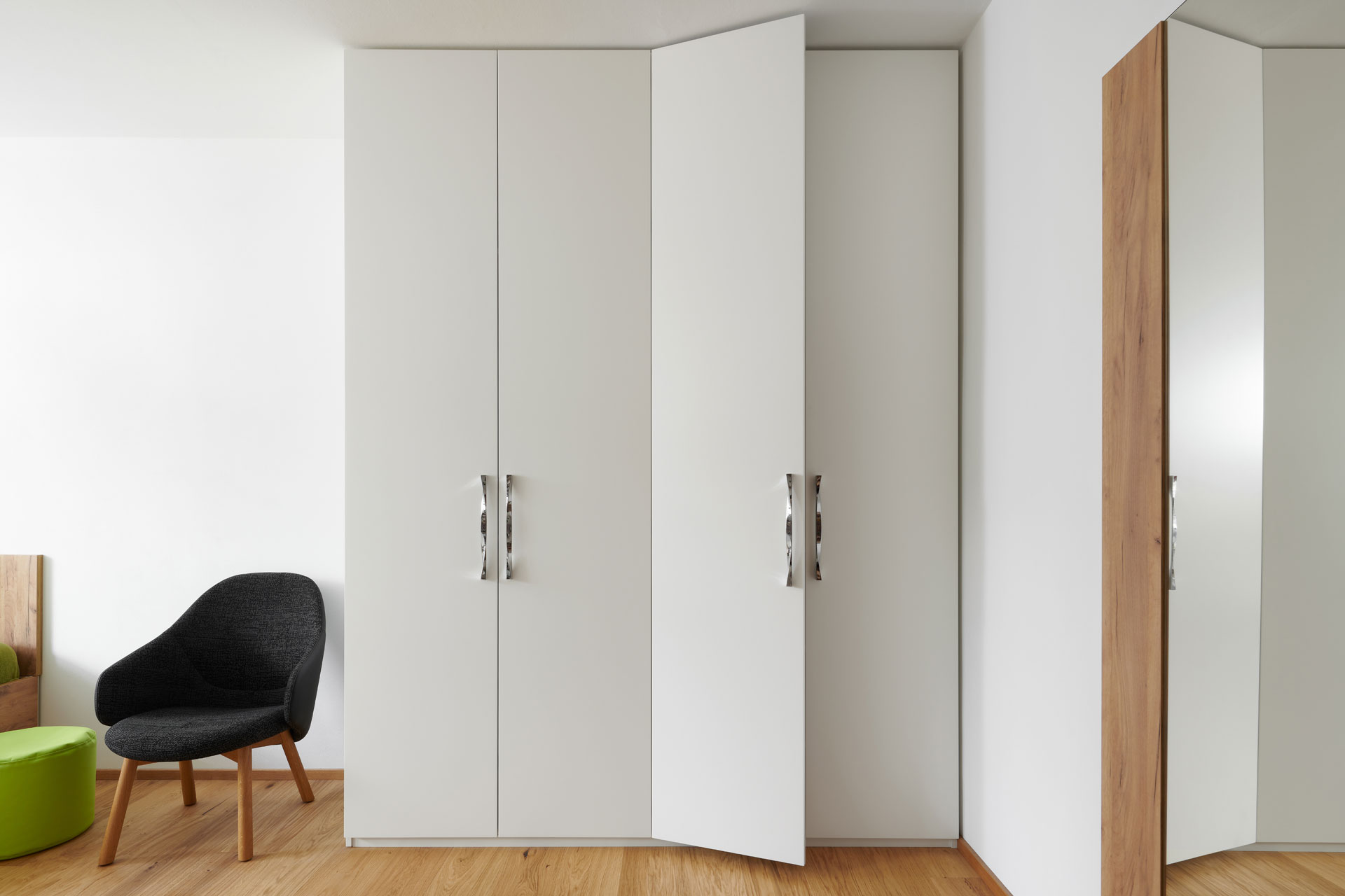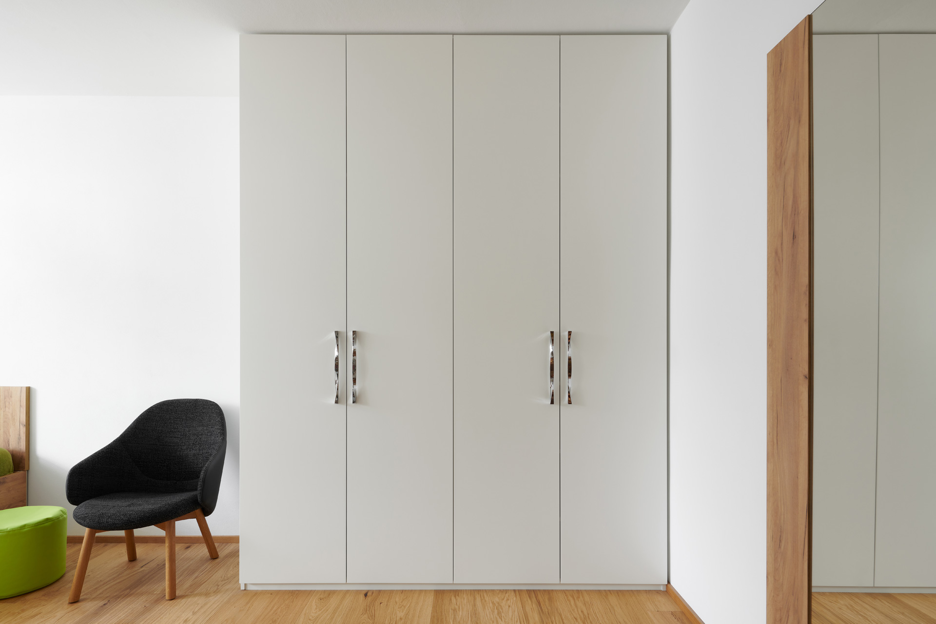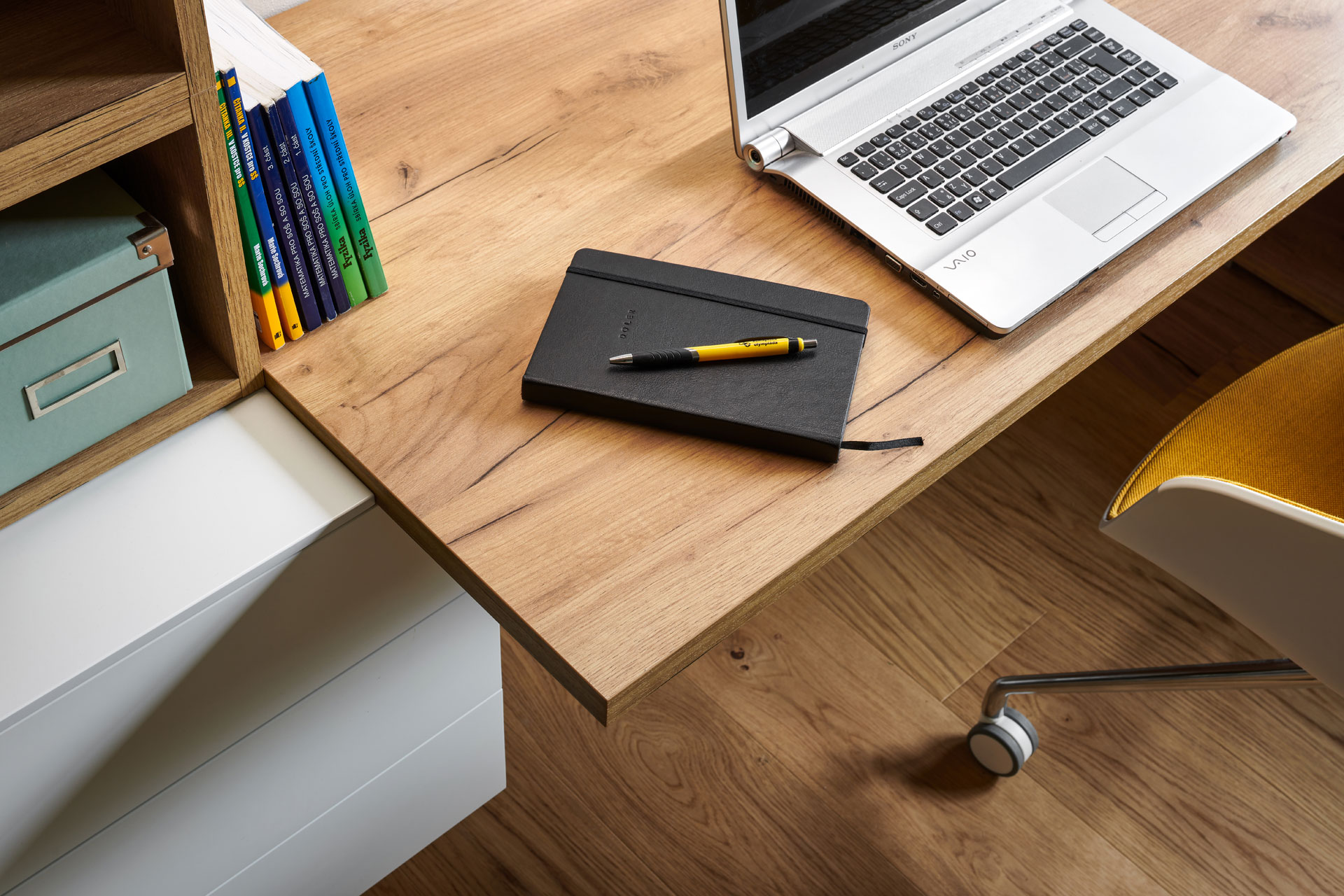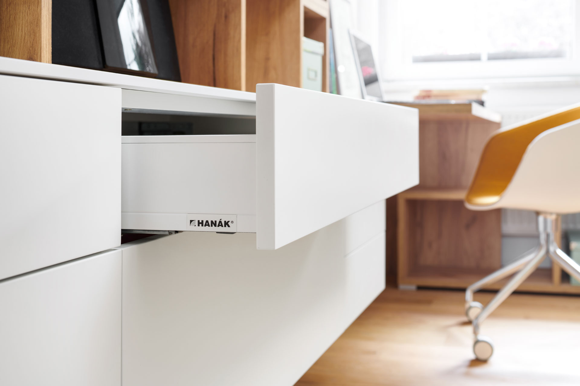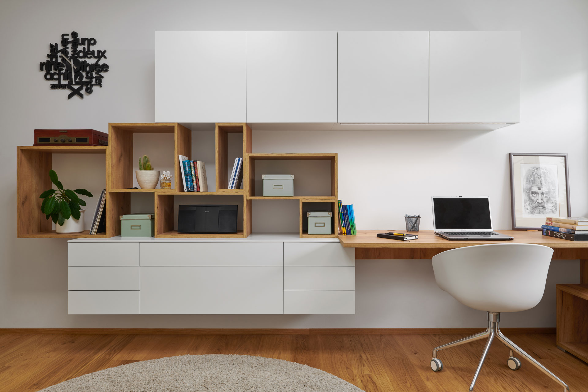 Realizace studentského pokoje v nadčasovém designu, kde projektantka navrhla profilovaný obklad stěny. Použila ho nejen za postel, ale slouží i jako věšáková stěna k odložení oblečení. Vkusná a zároveň hravá je sestava skříněk a otevřených nik u pracovní plochy.
