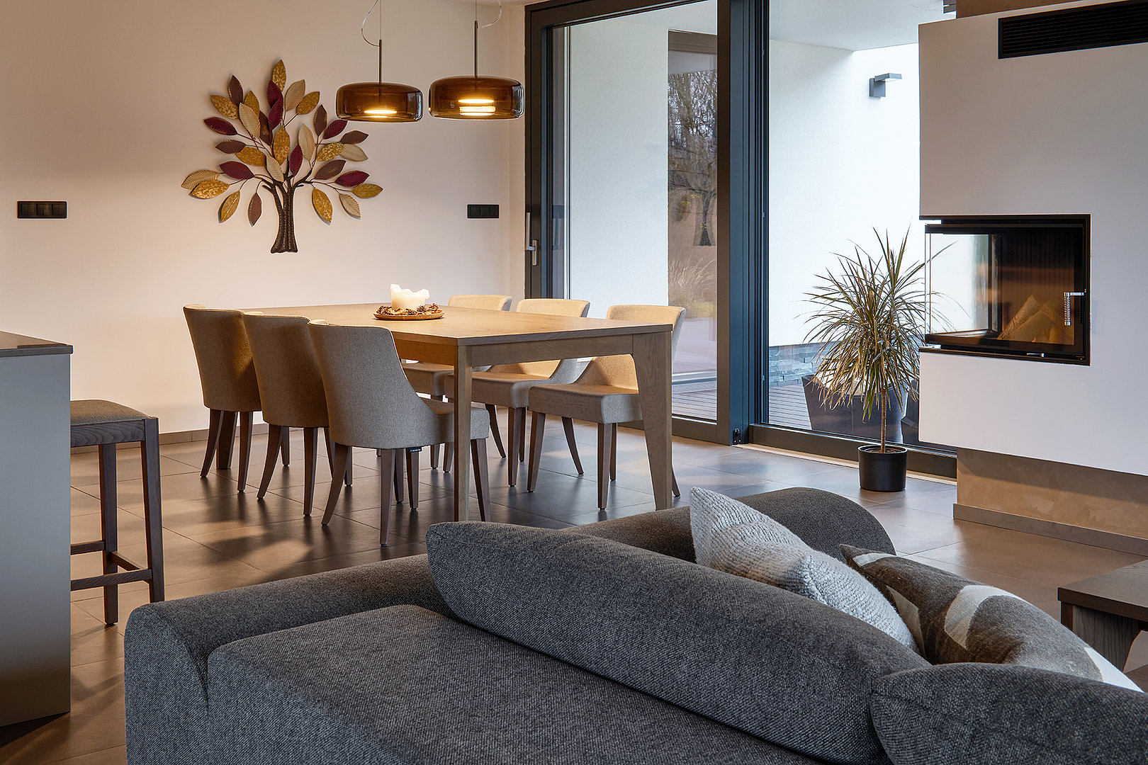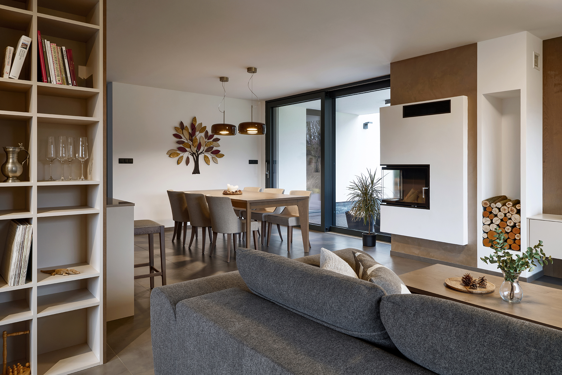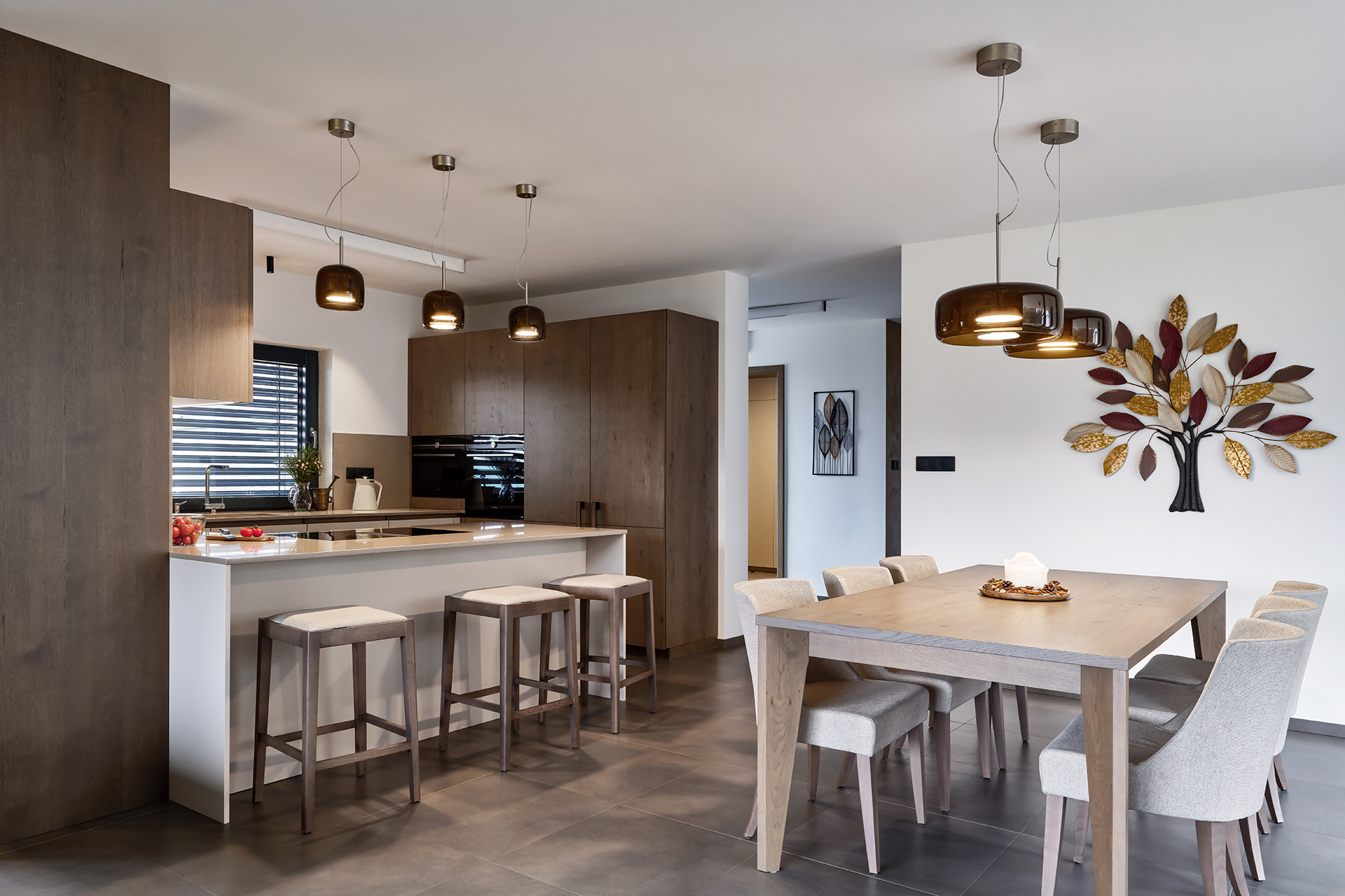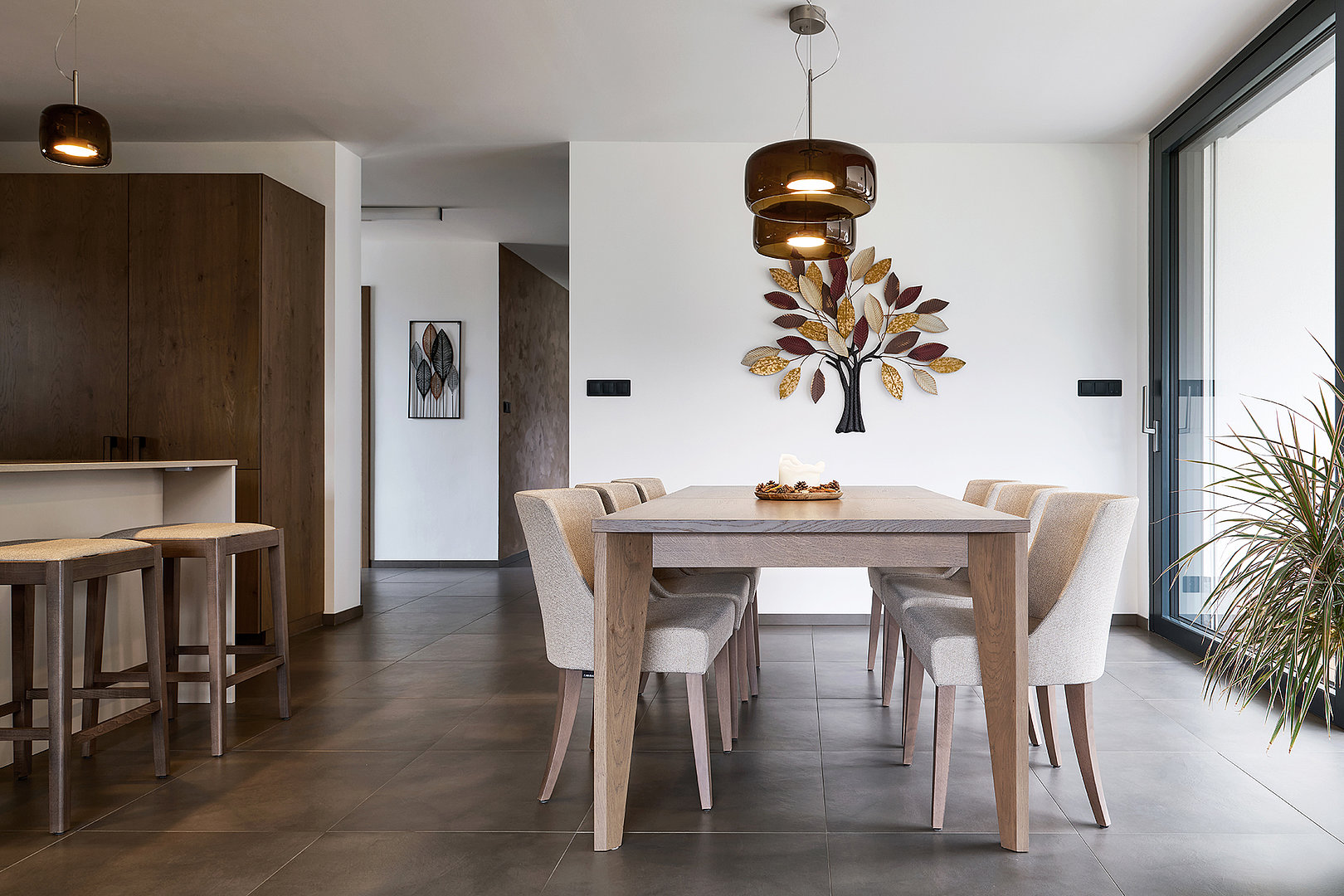V této elegantní jídelně se snoubí přírodní tóny s nadčasovým designem. Dominantou prostoru je rozkládací jídelní stůl JS32, vyrobený z dýhy dub rustikál šedý, který svým jemným odstínem a precizním zpracováním přirozeně zapadá do celkového ladění interiéru.