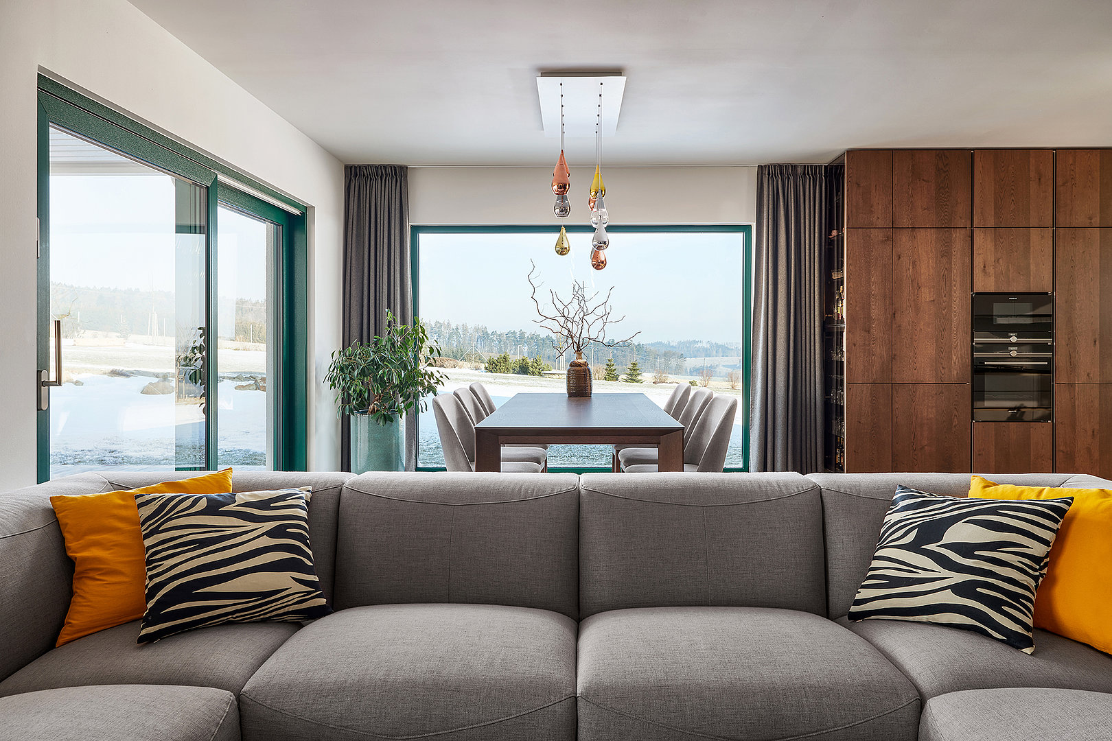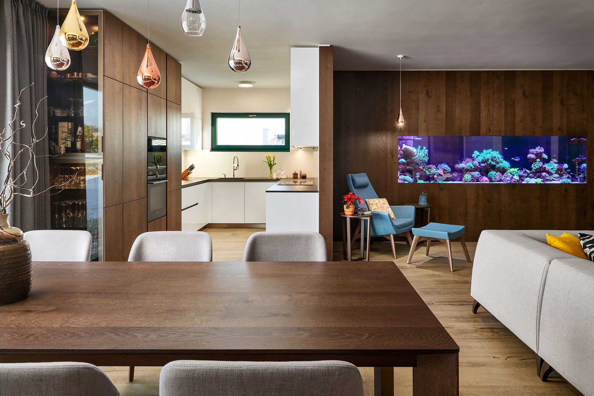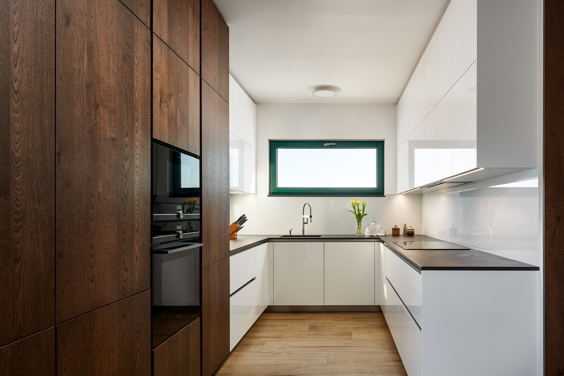 Pro tuto realizaci interiéru v rodinném domě byla použita kuchyně ELITE – bílý lak Polar s leskem, dýha dub rustikal hnědý a pracovní deska Dekton Kelya.