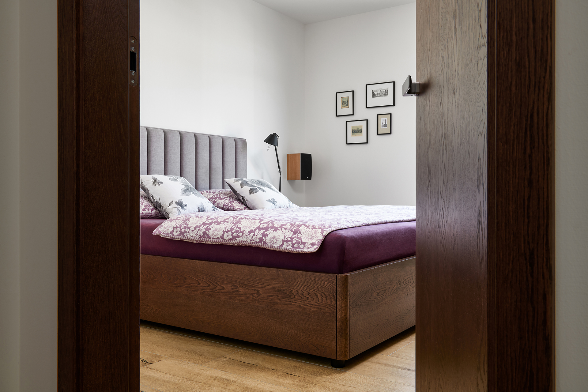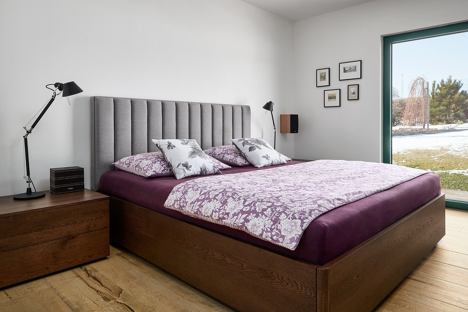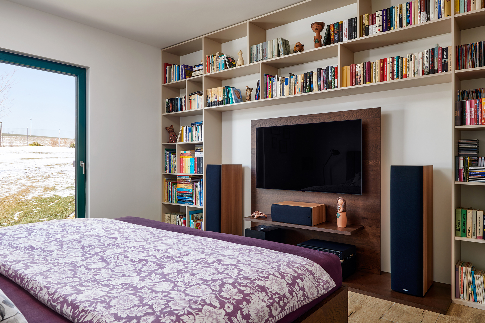 Do ložnice byla vybrána prostorná knihovna v materiálu lamino v barvě Champagne, který vévodí i šatně.