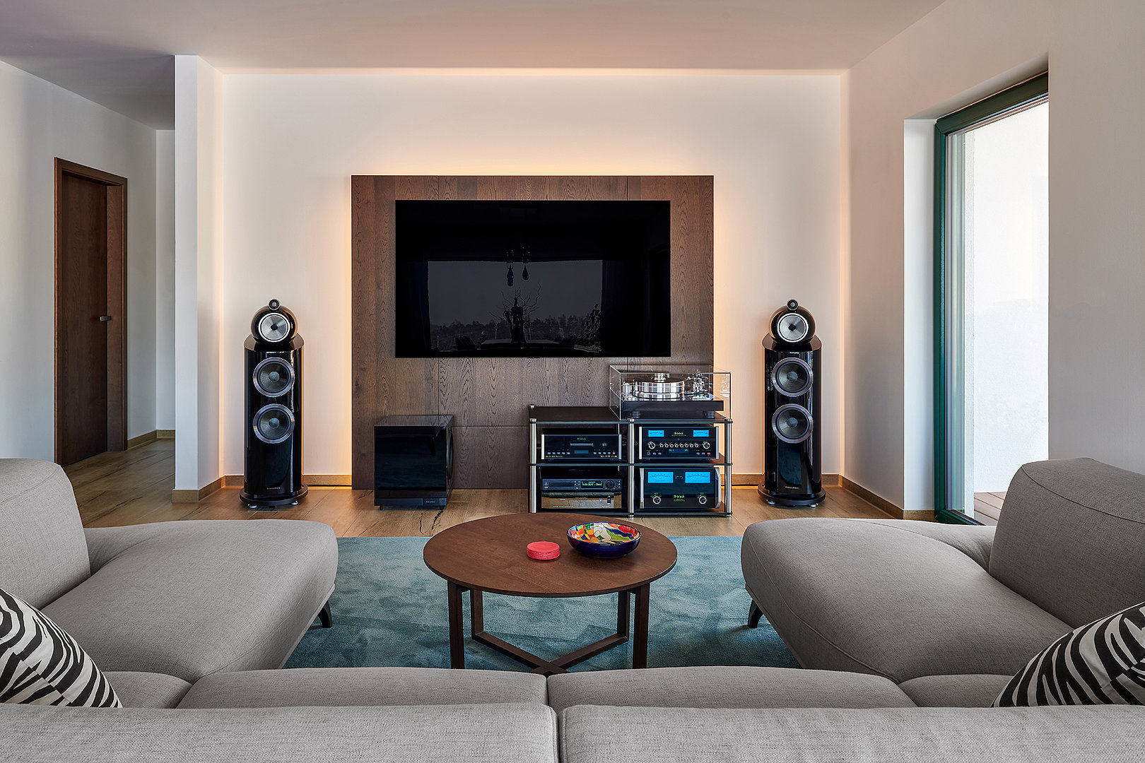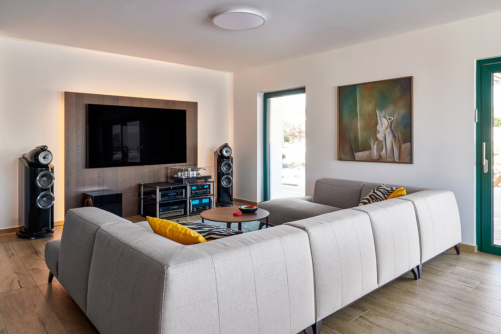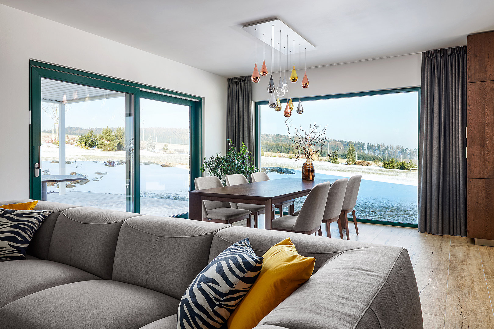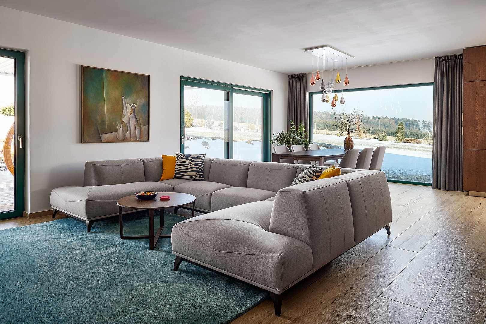 V prostorném obývacím pokoji dominuje sedačka GENESIS společně s jídelním stolem, který doplnily židle NORMAN – potah Kimber.