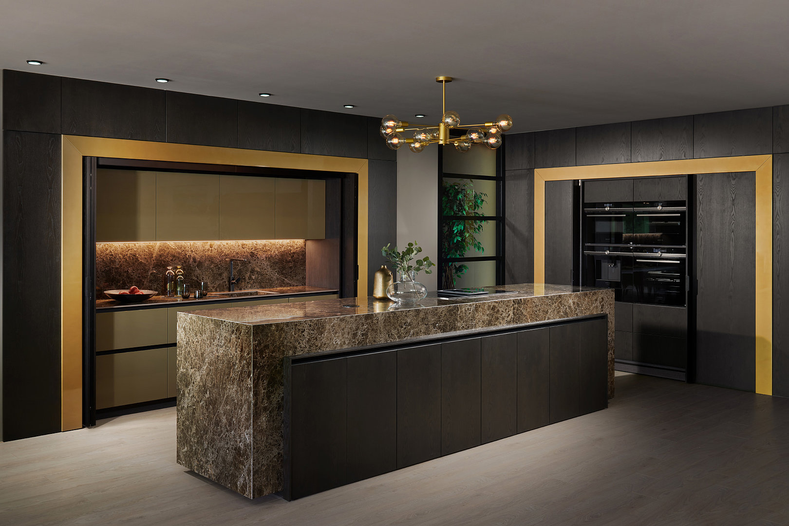 Exkluzivní záležitost. Velkorysá kuchyně v nadstandardním metalickém laku, s dominantním pracovním ostrůvkem ve výrazném dekoru.
