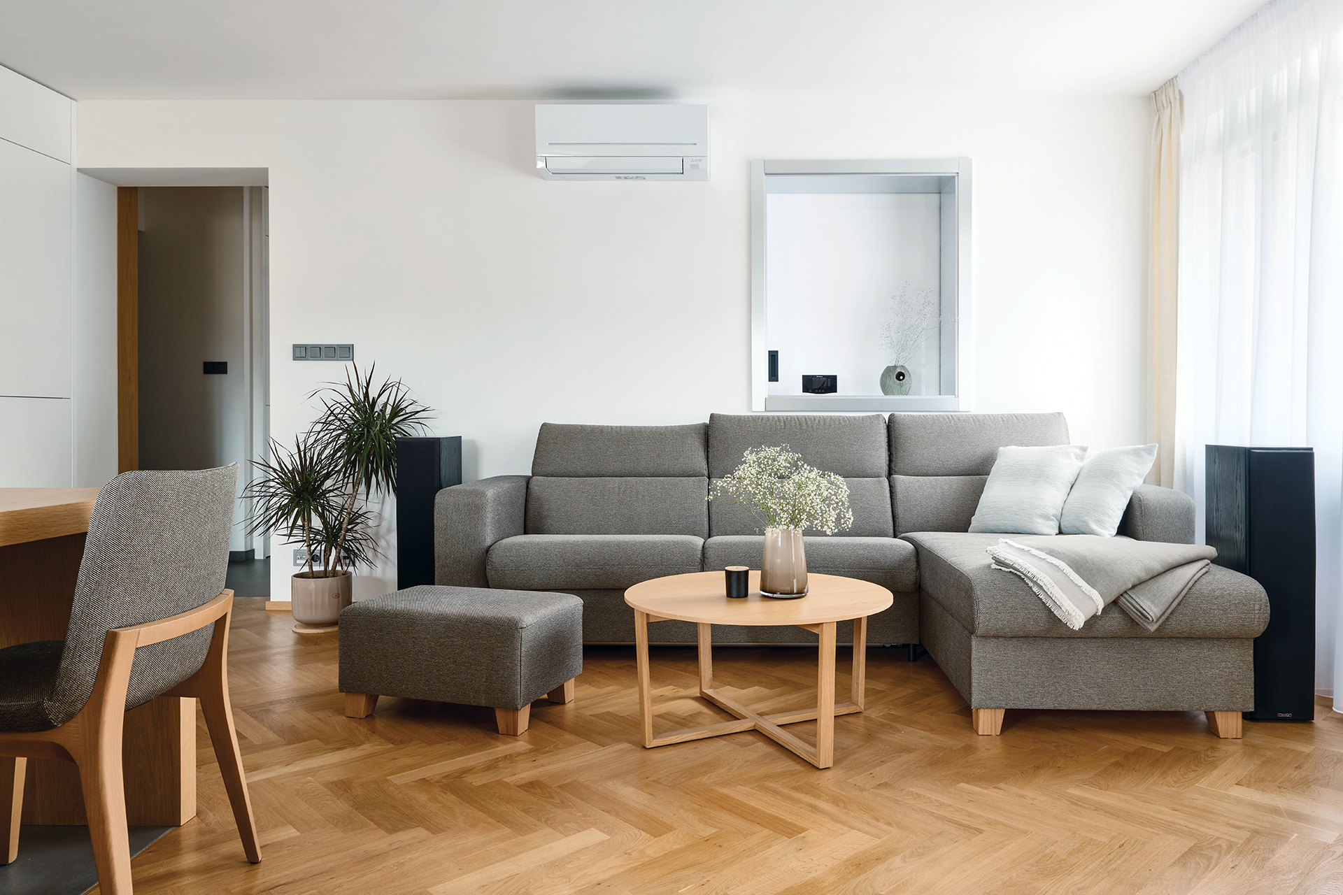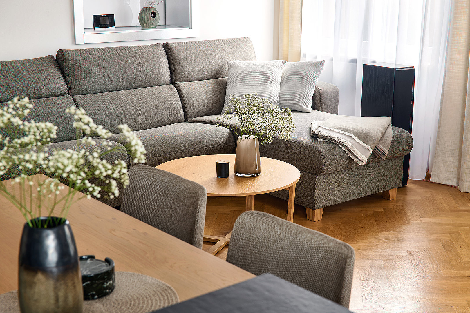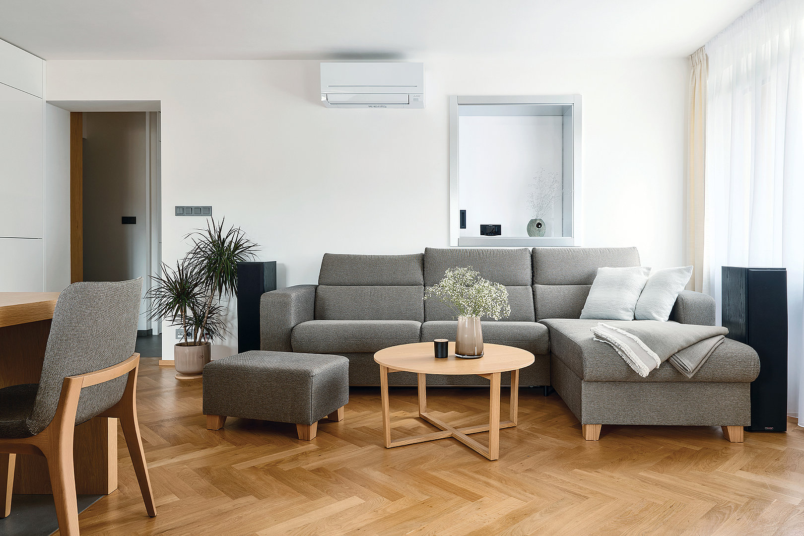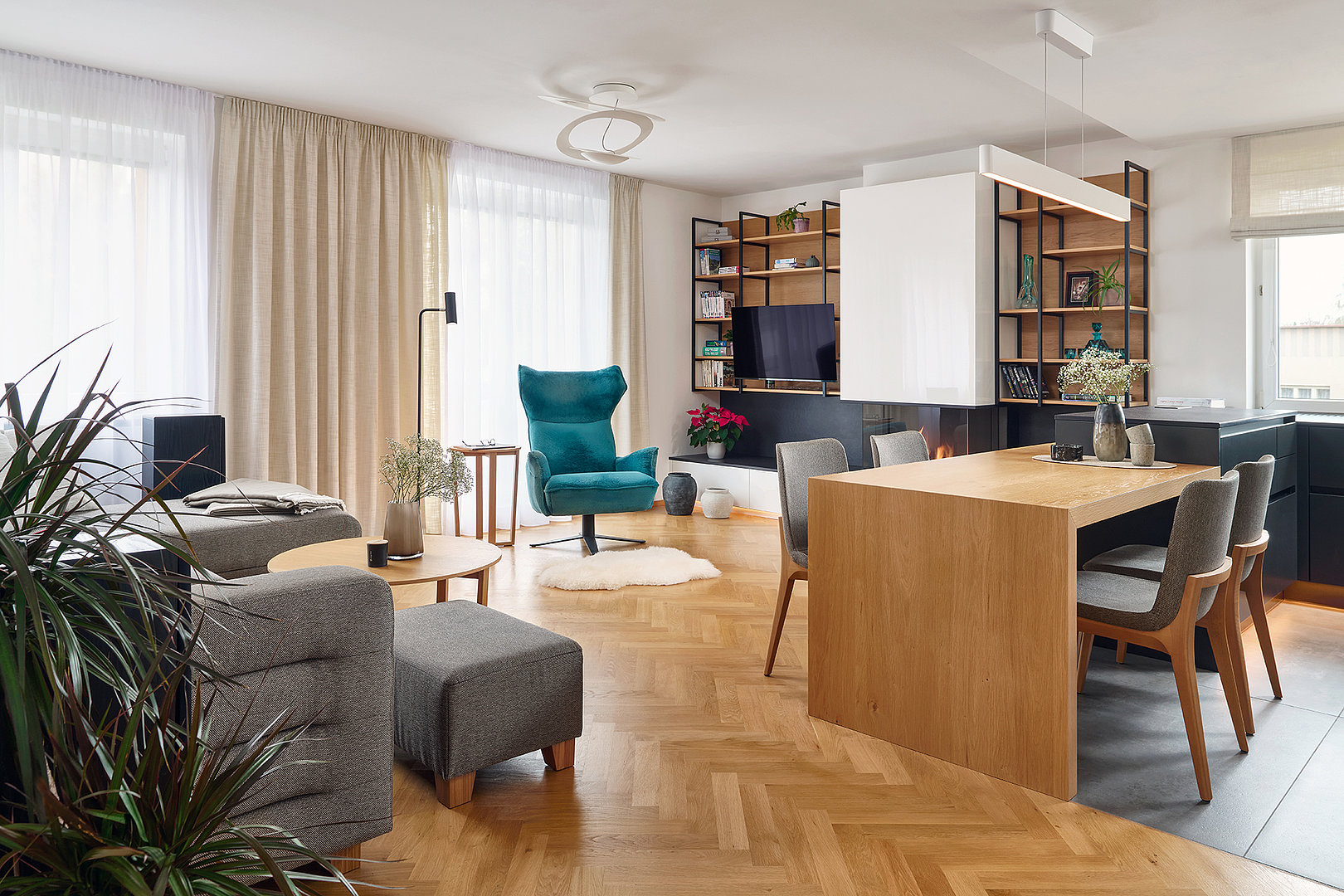 Dominantou prostoru je pohodlná sedačka s taburetem značky B.E.D., jejichž čisté linie a kvalitní provedení přirozeně zapadají do celku. Celkový dojem podtrhují konferenční stolky KS18 z dubové dýhy, které díky své různé výšce působí hravě, a přitom prakticky.
