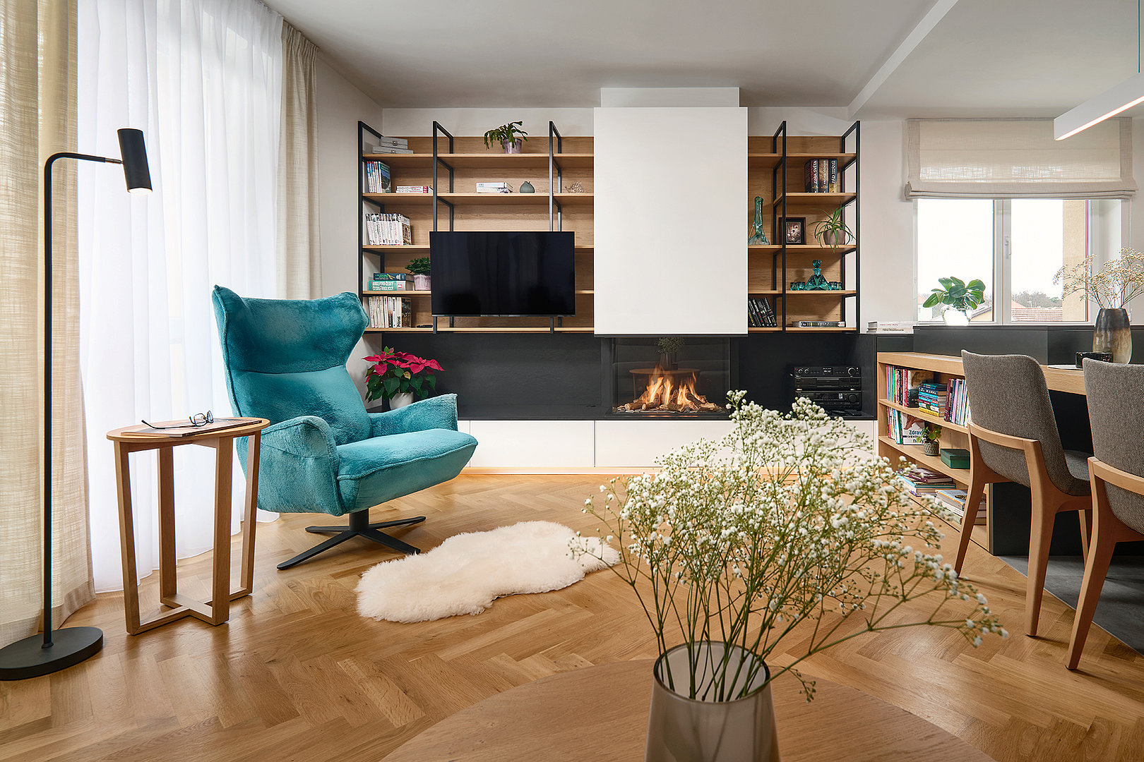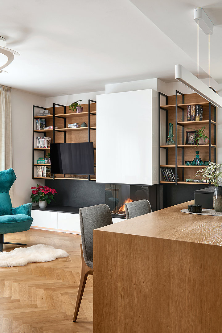 Kombinace bílého nábytku s dubovými prvky a jemnou kovovou konstrukcí polic působí odlehčeně a přitom stabilně. Výrazným akcentem se stává designový krb s černým obkladem z materiálu Dekton, který prostoru dodává hloubku a vizuální vyváženost.