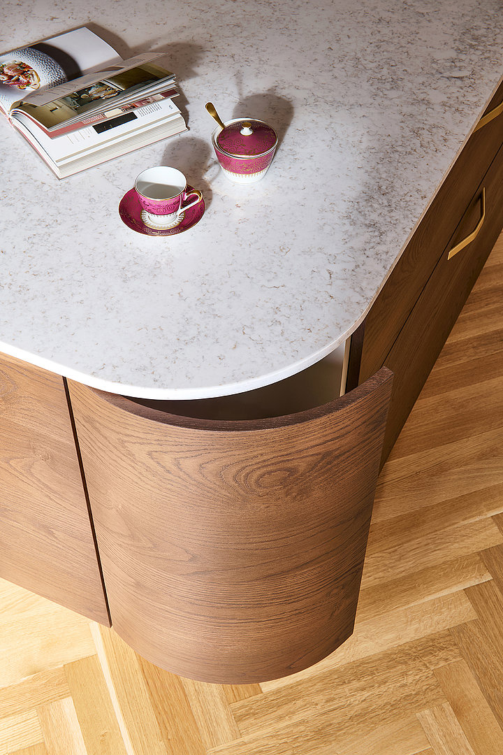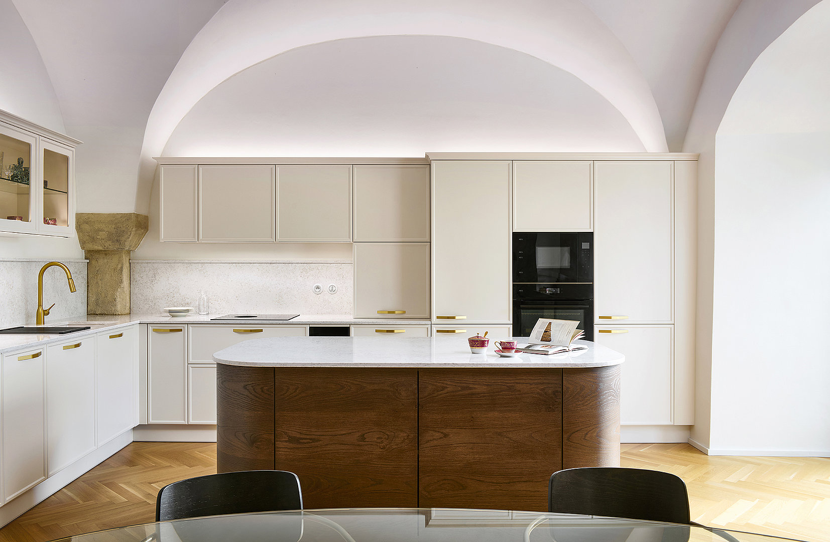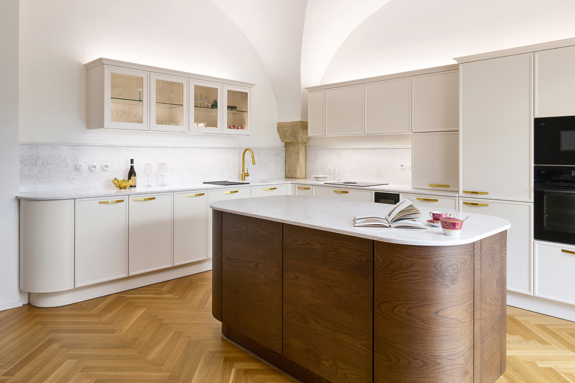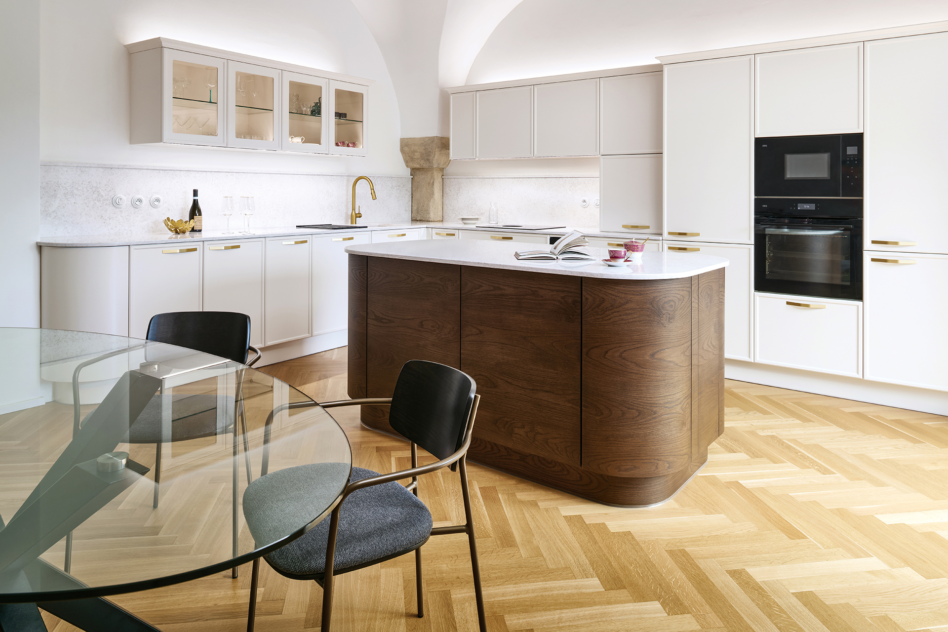 Центральным элементом и визуальным центром всей кухни является остров LINE в исполнении из дуба рустикального коричневого цвета. Закругленные края способствуют плавному движению по комнате и смягчают общее впечатление. Сочетание натурального дерева и технического камня придает острову визуальную глубину и ощущение настоящего качества на ощупь. Премиальная столешница Technistone Wedding Lily подчеркивает эксклюзивный характер и одновременно обеспечивает максимальную прочность при ежедневном использовании.