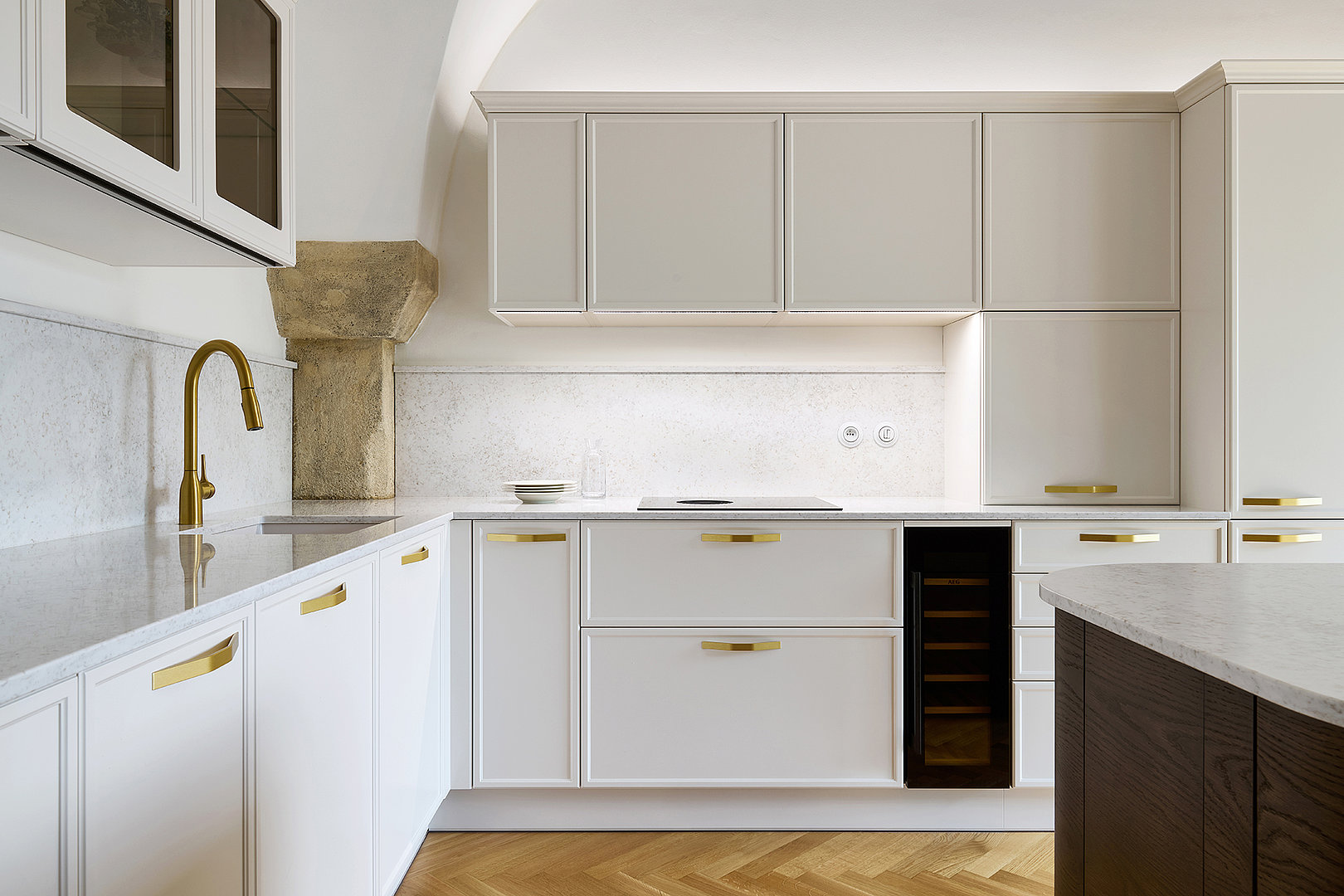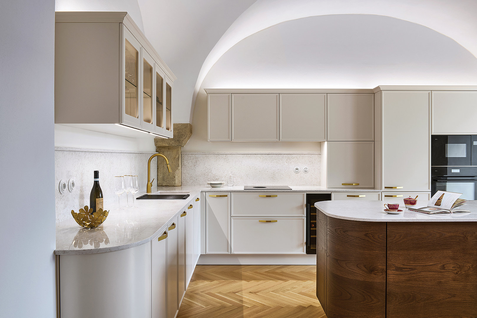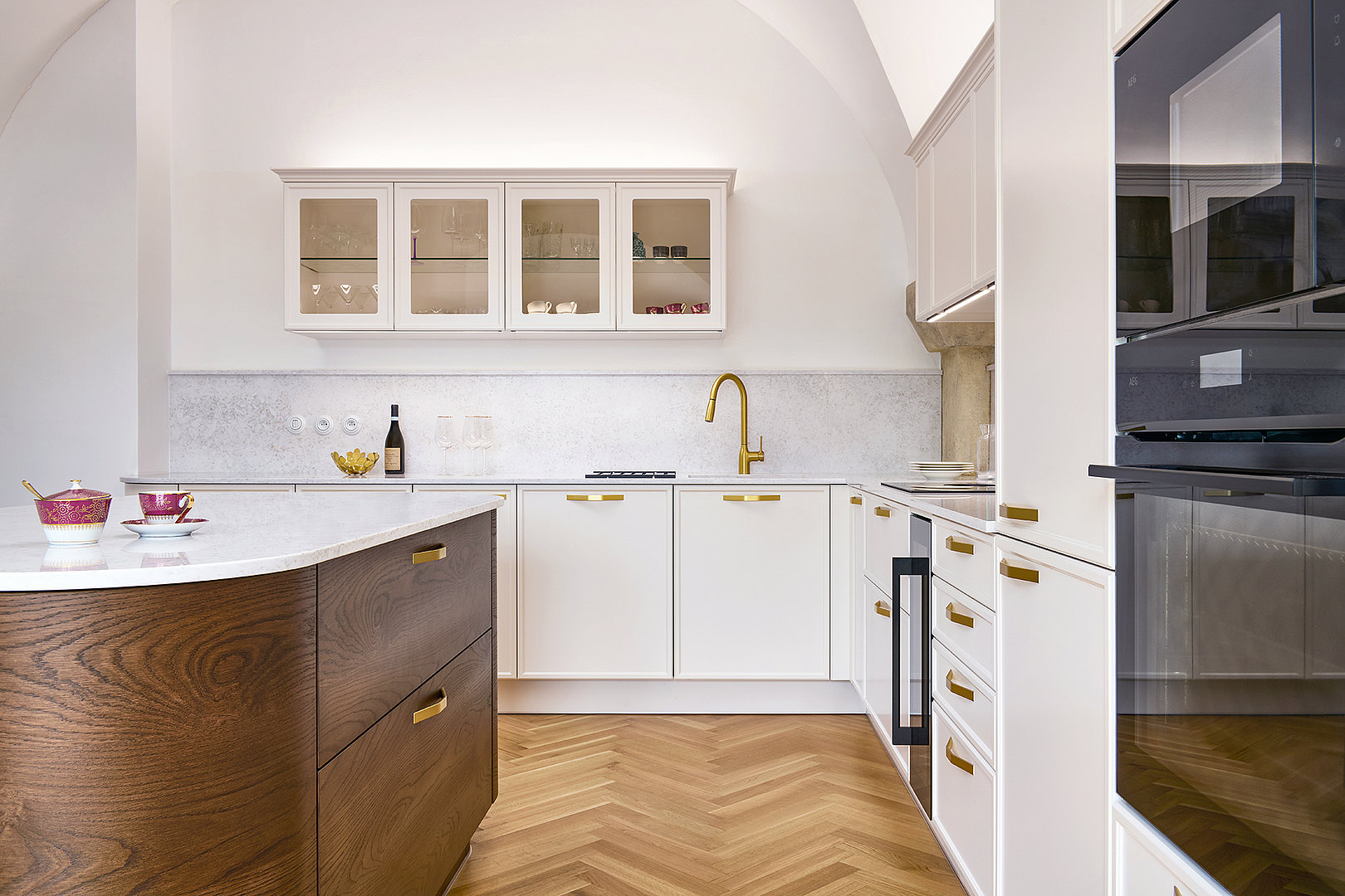 Доминантой всего пространства является модель LYON в матовом лаке Antik white, которая своим нежным оттенком естественно продолжает историческую архитектуру. Минималистичные формы позволяют выделить качество исполнения и детали – элегантные латунные ручки или подсвеченные витрины придают интерьеру легкость и воздушность.