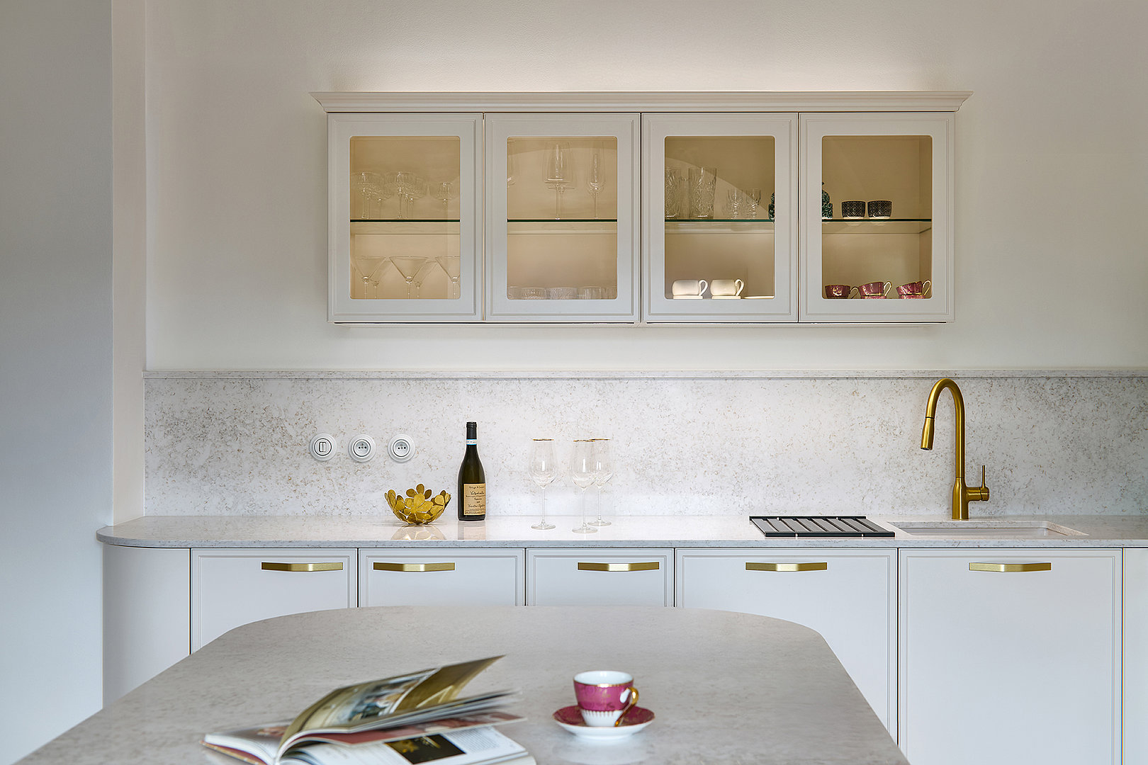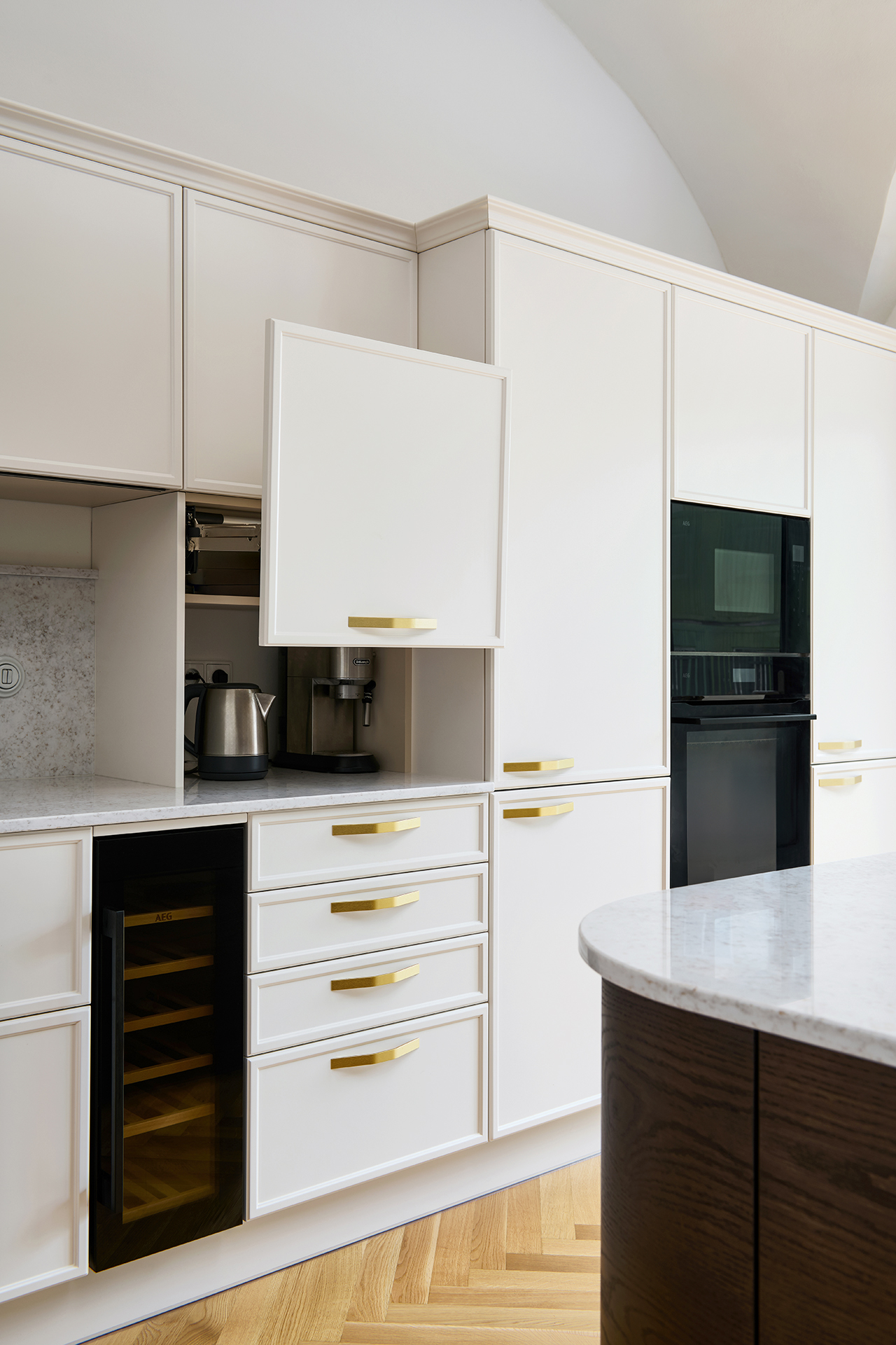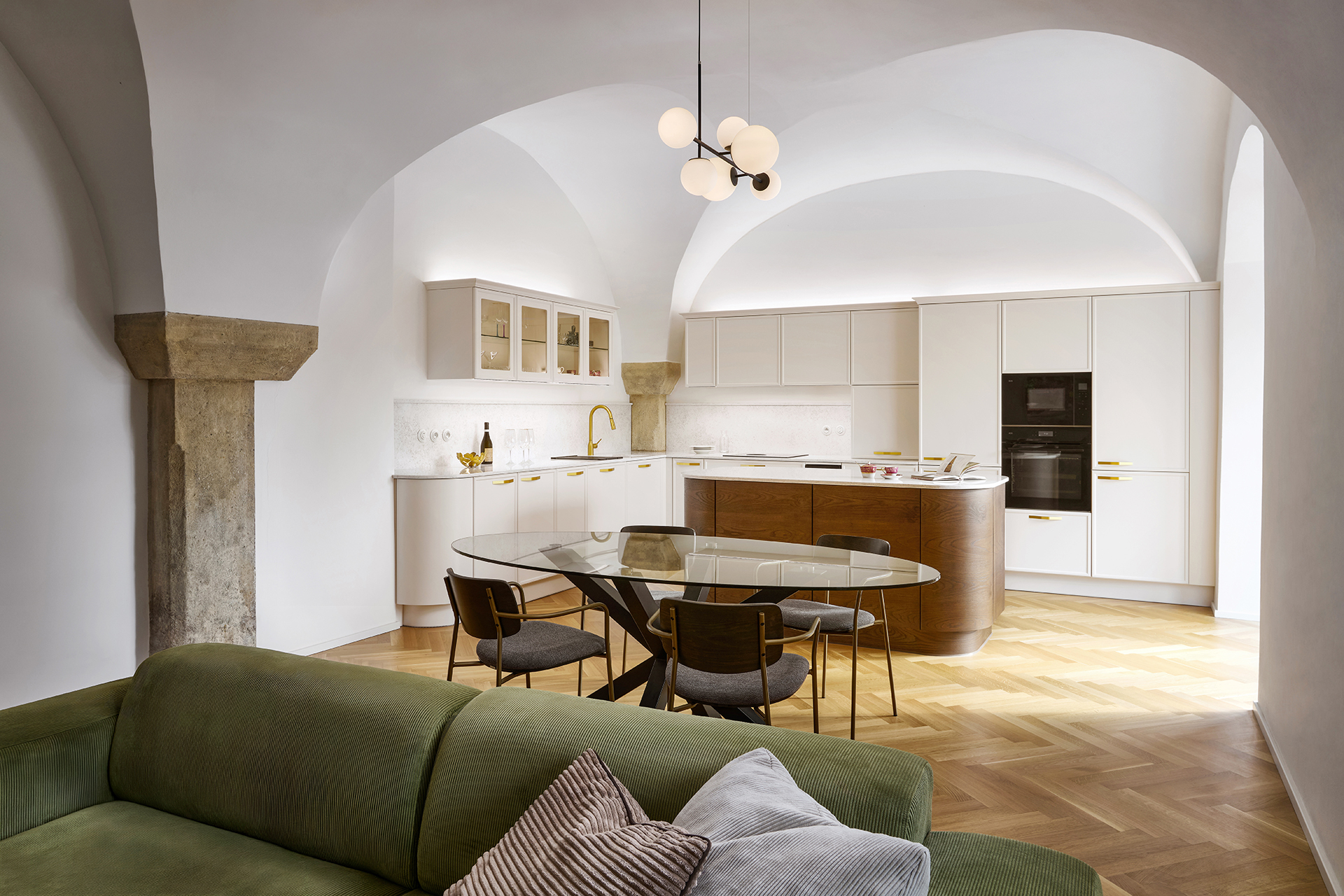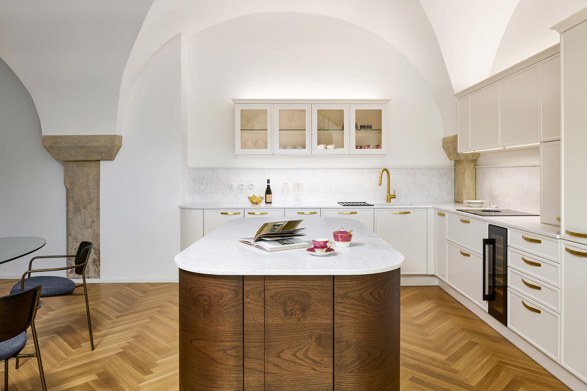 Доминантой всего пространства является модель LYON в матовом лаке Antik white, которая своим нежным оттенком естественно продолжает историческую архитектуру. Минималистичные формы позволяют выделить качество исполнения и детали – элегантные латунные ручки или подсвеченные витрины придают интерьеру легкость и воздушность.