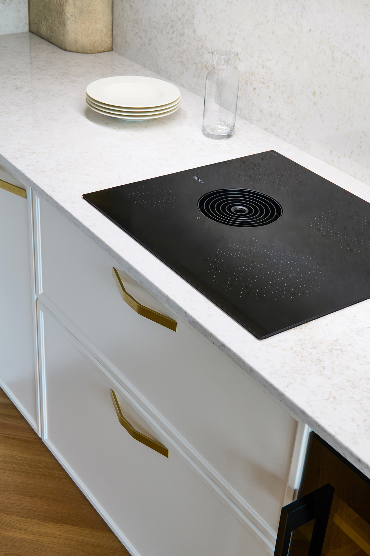 За идеально чистыми линиями скрывается современная технология высочайшего качества. Варочная панель BORA со встроенной вытяжкой, бытовая техника AEG и керамическая раковина SYSTEMCERAM элегантно скрыты в целом, который выглядит гармонично и не отвлекает внимания.