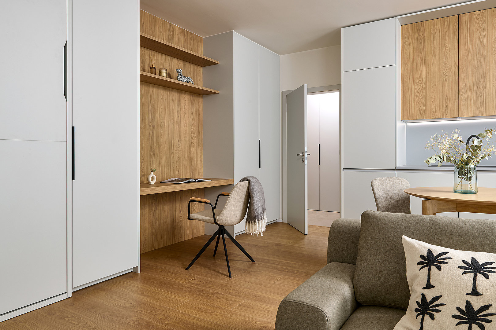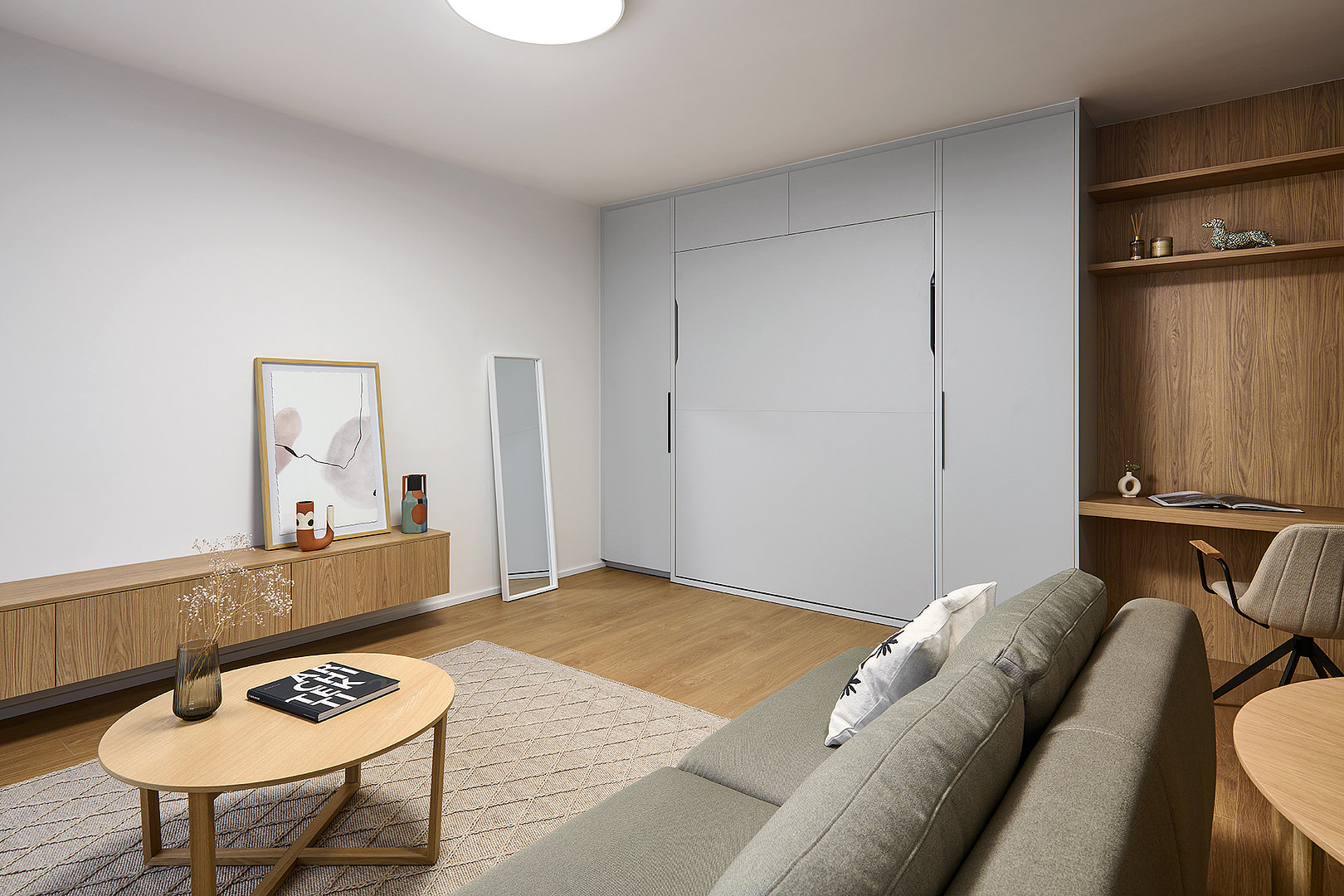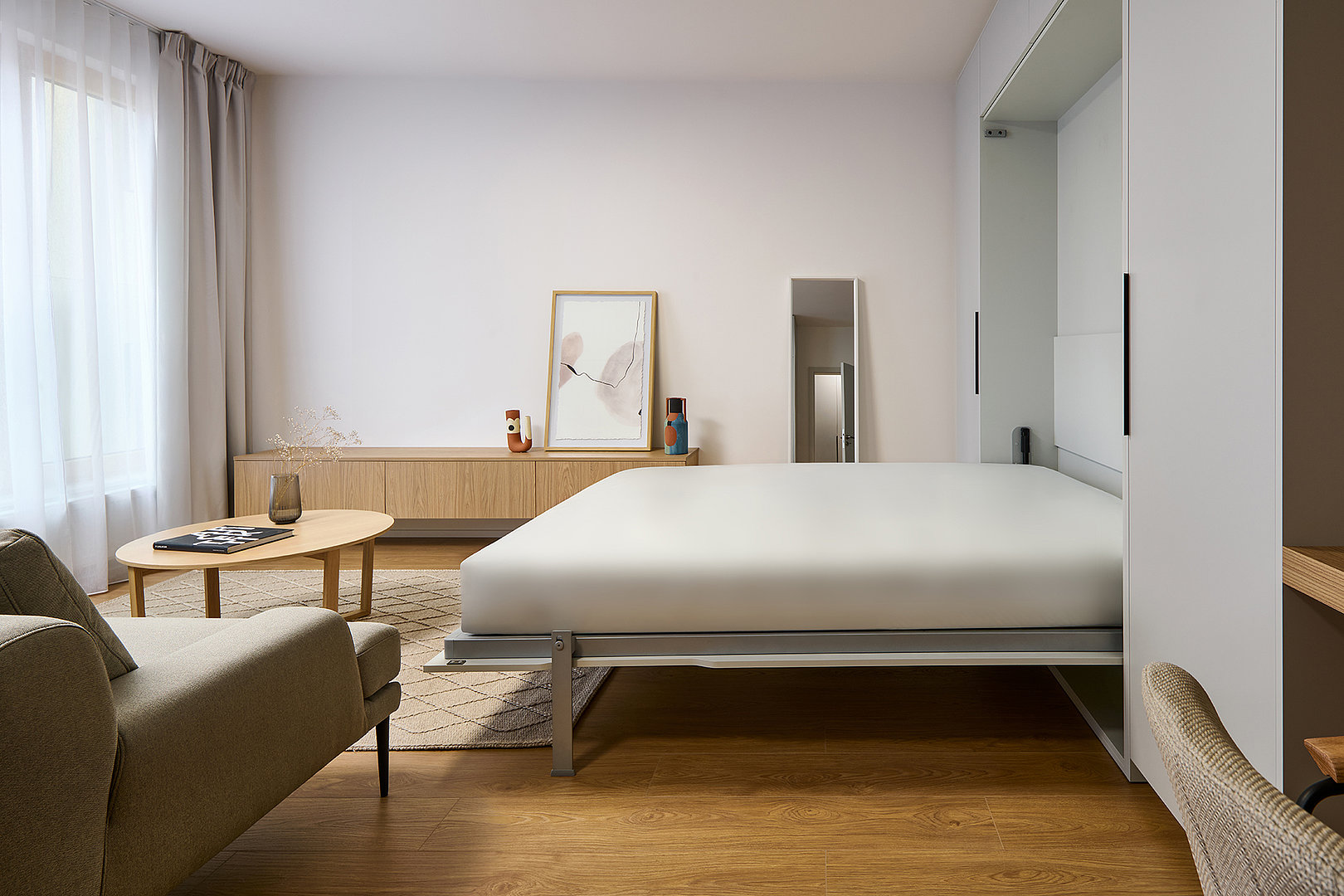 Dominantným prvkom riešenia je sklopná posteľ FLIP, ktorá dodáva interiéru ľahkosť a voľnosť pohybu. Vďaka nej zostáva priestor otvorený a vzdušný bez kompromisov v oblasti komfortu. Počas dňa byt plnohodnotne slúži dennému životu, večer sa nenápadne mení na pokojné miesto oddychu. Posteľ je prirodzene integrovaná do nábytkovej zostavy a zachováva čisté línie interiéru.