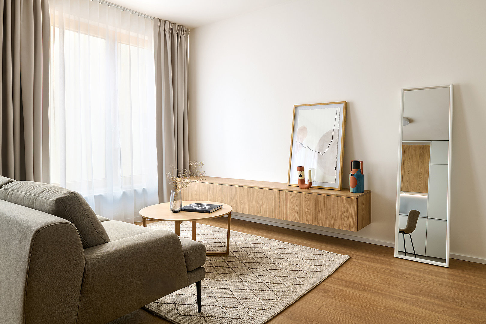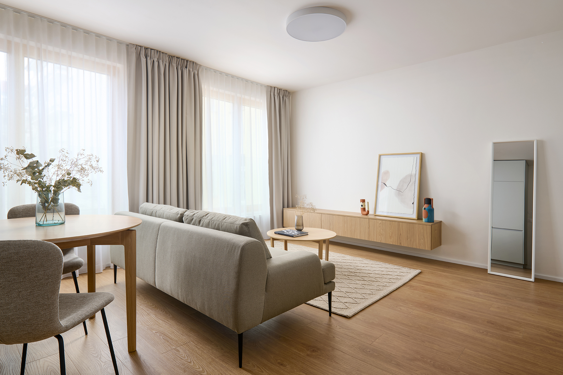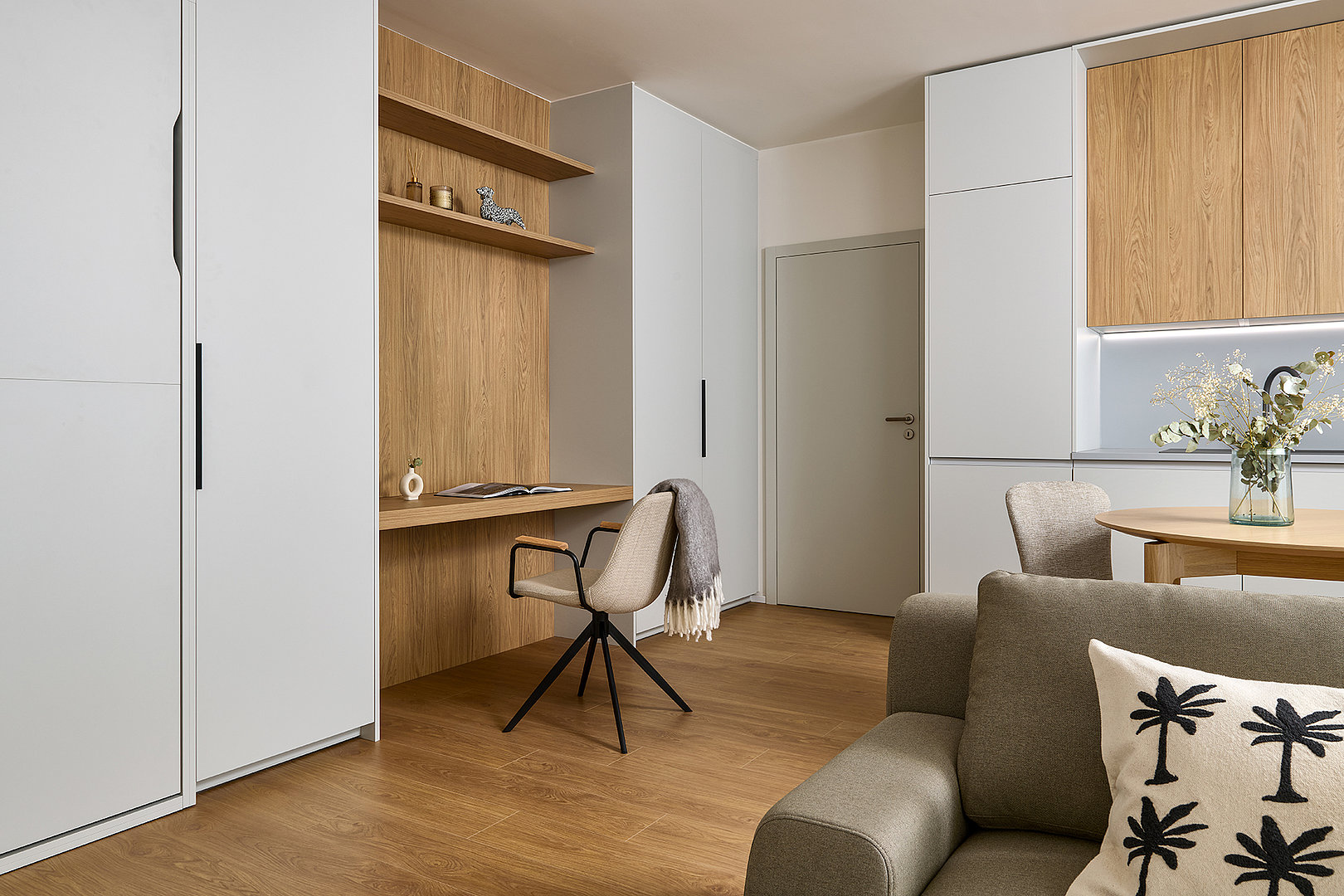Dominantným prvkom riešenia je sklopná posteľ FLIP, ktorá dodáva interiéru ľahkosť a voľnosť pohybu. Vďaka nej zostáva priestor otvorený a vzdušný bez kompromisov v oblasti komfortu. Počas dňa byt plnohodnotne slúži dennému životu, večer sa nenápadne mení na pokojné miesto oddychu. Posteľ je prirodzene integrovaná do nábytkovej zostavy a zachováva čisté línie interiéru.