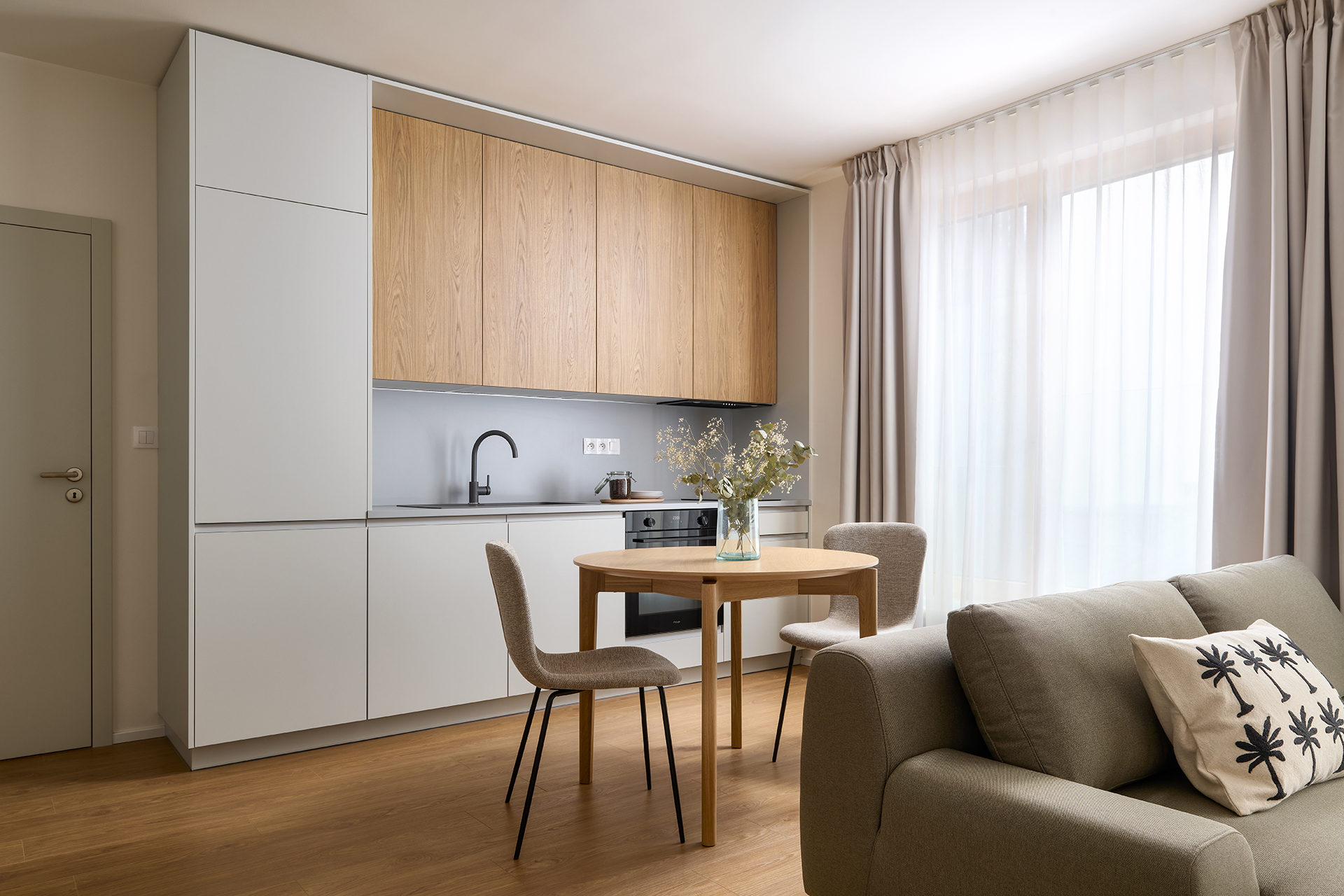 Interiér bytu 1+kk je navrhnutý ako flexibilný a prirodzene variabilný priestor, ktorý sa prispôsobuje rytmu dňa. Kuchyňa SIMPLE v kombinácii sivého lamina a dekoru dub quercus sienna vytvára jednotný materiálový základ a pokojnú atmosféru celého bytu.